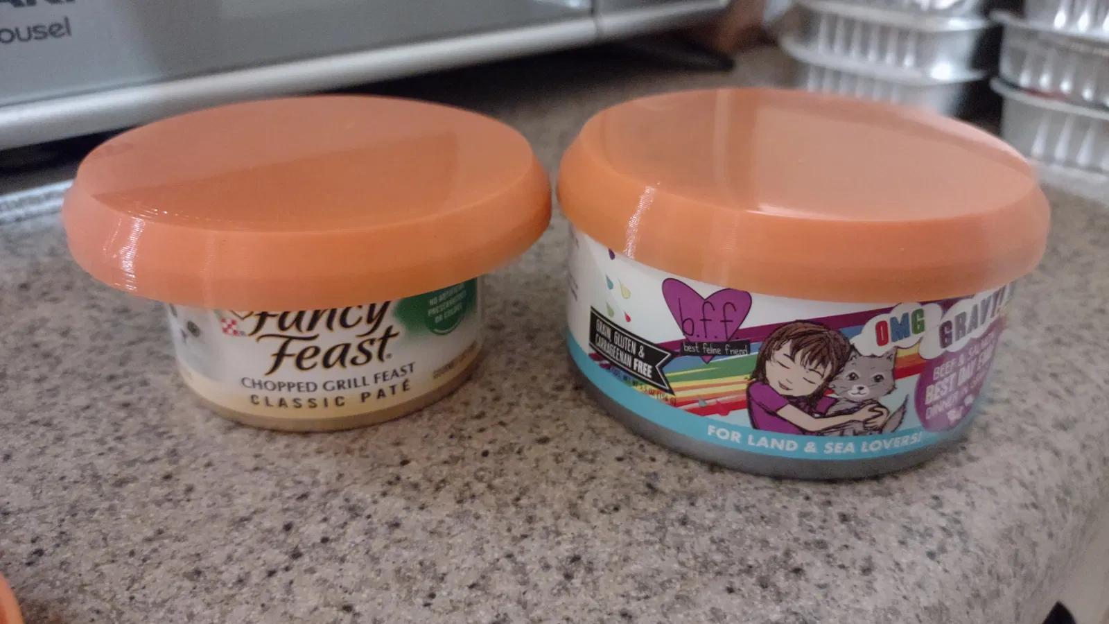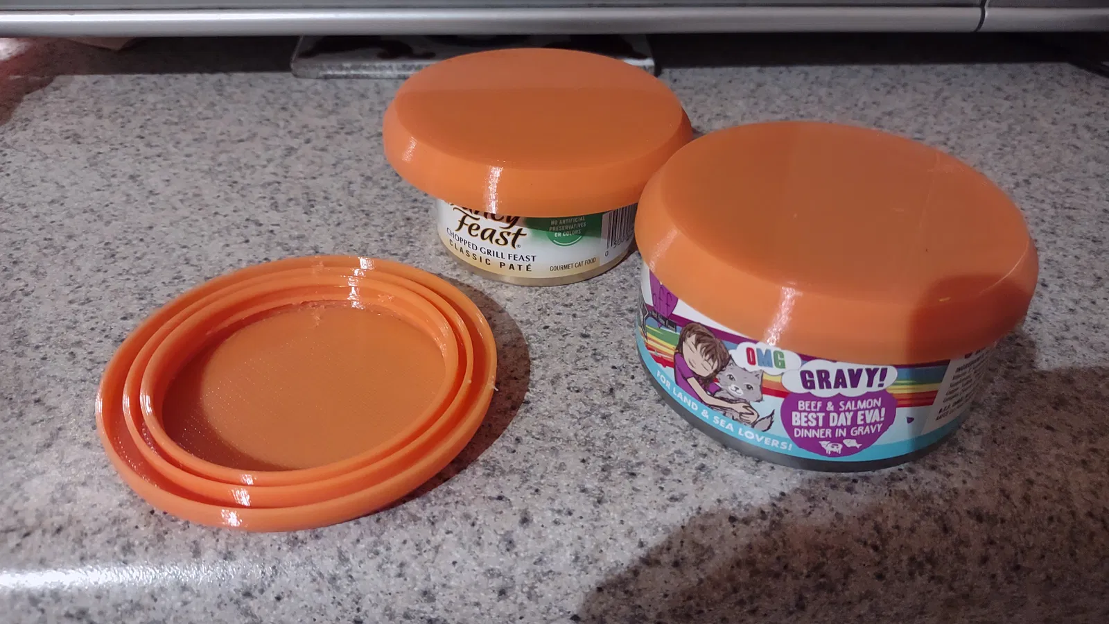 In, không cần hỗ trợ. Nên xài TPU hoặc nhựa dẻo tương tự. Nắp này fit với 4 cỡ lon khác nhau. Có 2 cỡ nhỏ ở giữa cho lon thức ăn mèo nhỏ, nhấn hết cỡ để vô lon như Fancy Feast hoặc nhấn nửa cỡ cho các lon tương tự có vành dày hơn. Rồi có 2 vòng lớn hơn cho các lon to hơn. Nắp đủ chặt để giữ hầu hết các lon mà không bị rớt, kể cả khi úp ngược hay cầm bằng nắp.