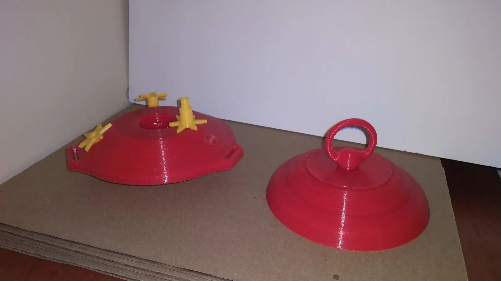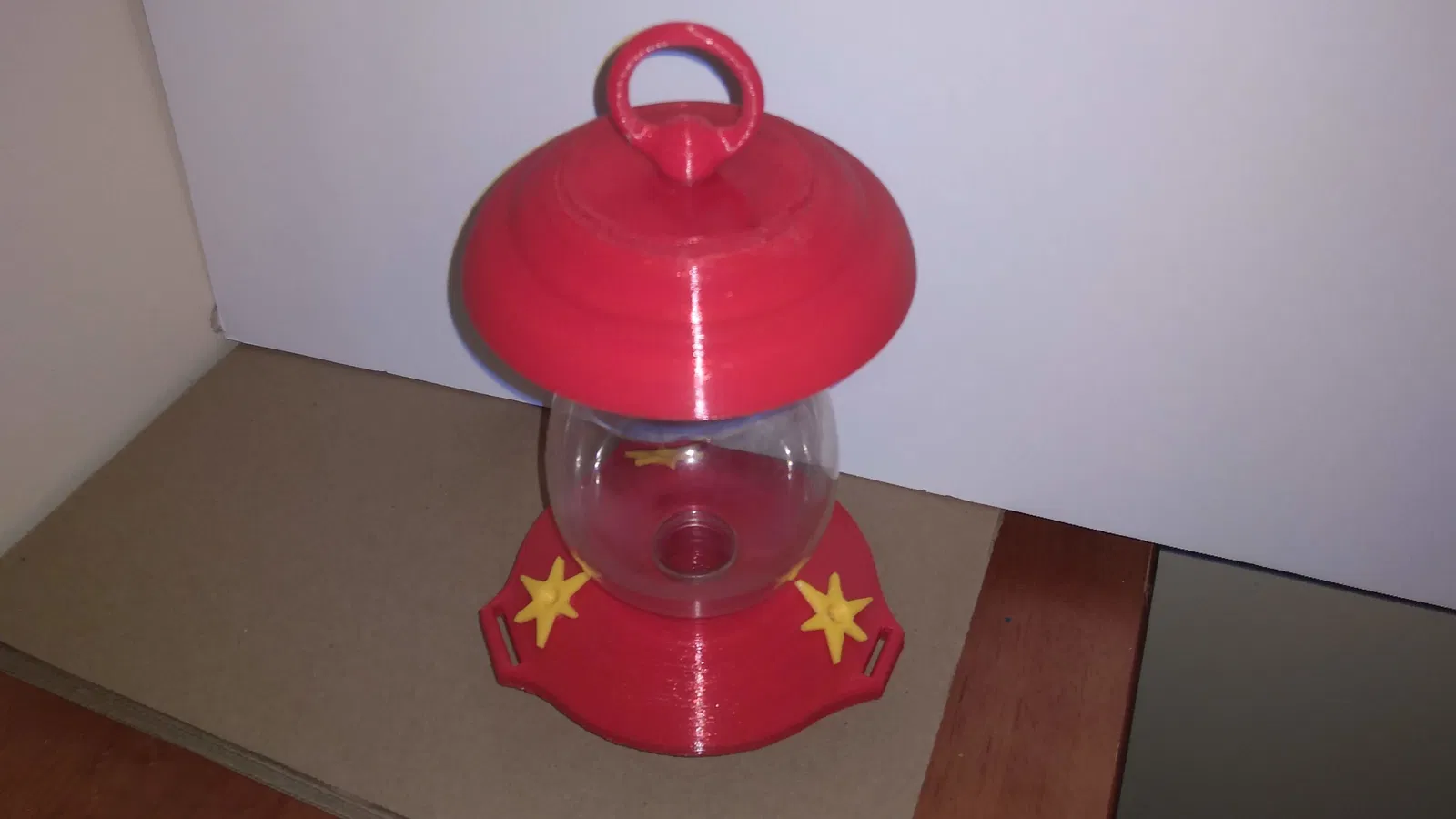 Cái máng ăn chim ruồi cũ bị bể, giờ tận dụng chai có sẵn thiết kế lại máng mới kèm 3 bông hoa có ren. Chất liệu PETG, in lớp 0.2mm, dùng support tháp cho chỗ đậu chim. Slicer Cura 5.0 xài "exclusive" slicing tolerance cho ren, khớp y như đúc.