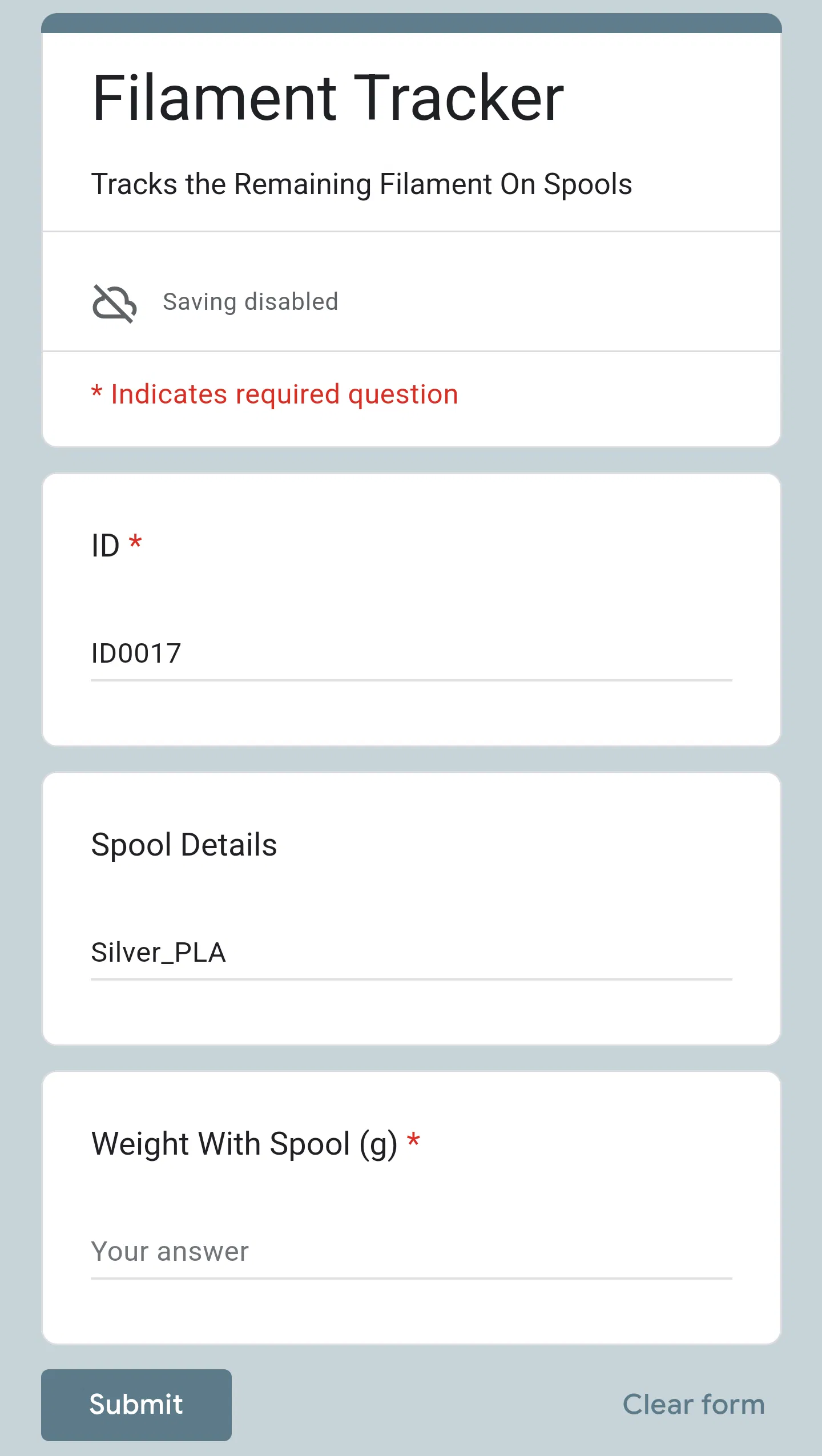 Khi quét mã QR của một cuộn chỉ, nó sẽ mở biểu mẫu và hiển thị cho tôi Số ID và thông tin cơ bản về cuộn chỉ, để tôi có thể xác nhận đúng cuộn chỉ. Sau đó, tôi cân cuộn chỉ (cả cuộn chỉ và nhựa), nhập trọng lượng vào biểu mẫu và gửi. Dữ liệu sẽ được cập nhật vào Bảng tính Google và nó sẽ lưu giữ hồ sơ, sử dụng giá trị mới nhất được cung cấp khi quét. Xem ảnh chụp màn hình ở đây về biểu mẫu và bảng tính để có ý tưởng về cách nó hoạt động.