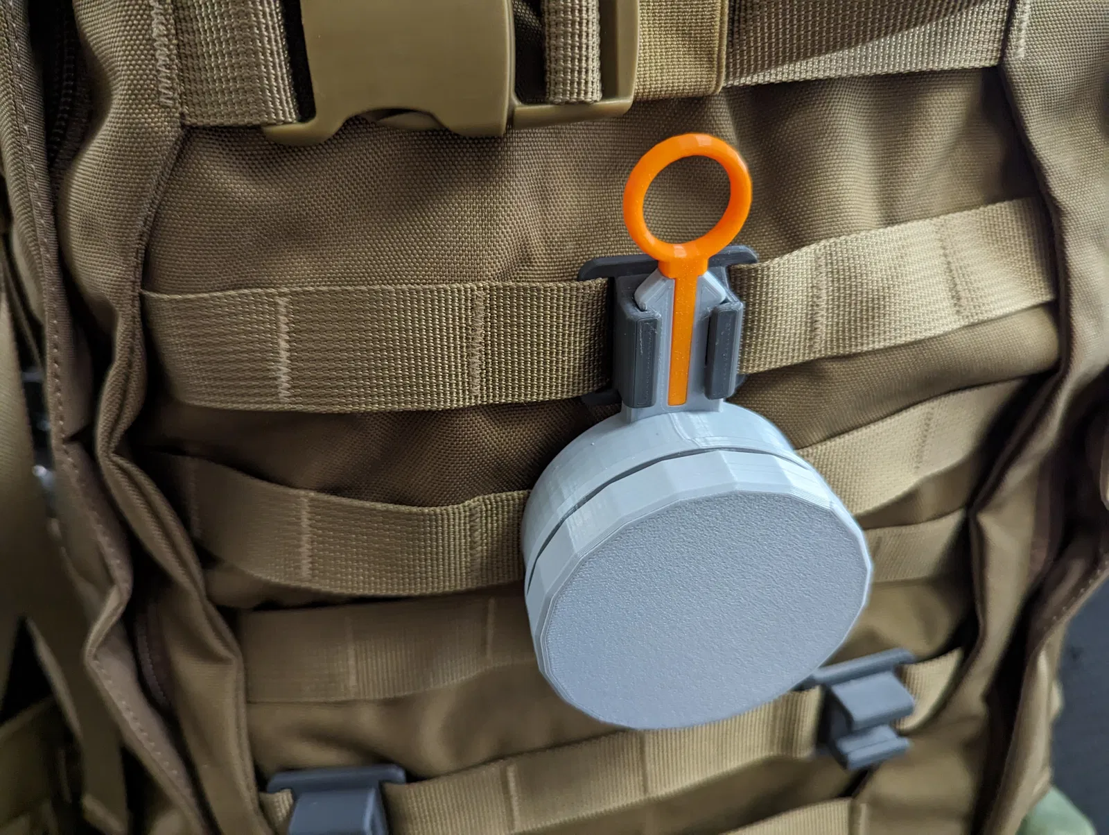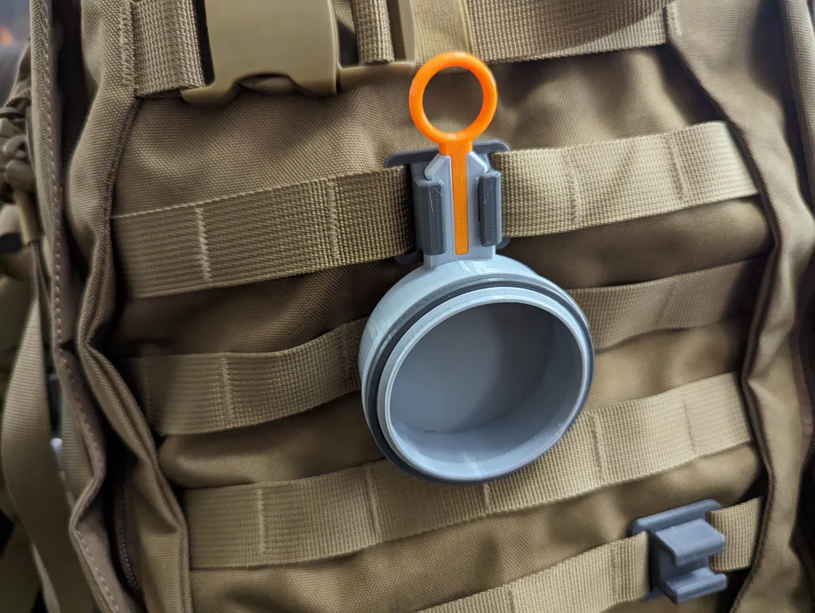 QUICK-CLIP là hệ thống gắn đồ đa năng mà mình thiết kế cho dây đeo balo và MOLLE. Đây là cái hũ nhỏ 60 mL (2 fl. oz.) có nắp xoay mà mình làm chung với bộ đế starter (bạn tìm trong trang của mình nha). Nó gắn và tháo khỏi hệ thống gắn theo cách y chang mấy cái module khác luôn.