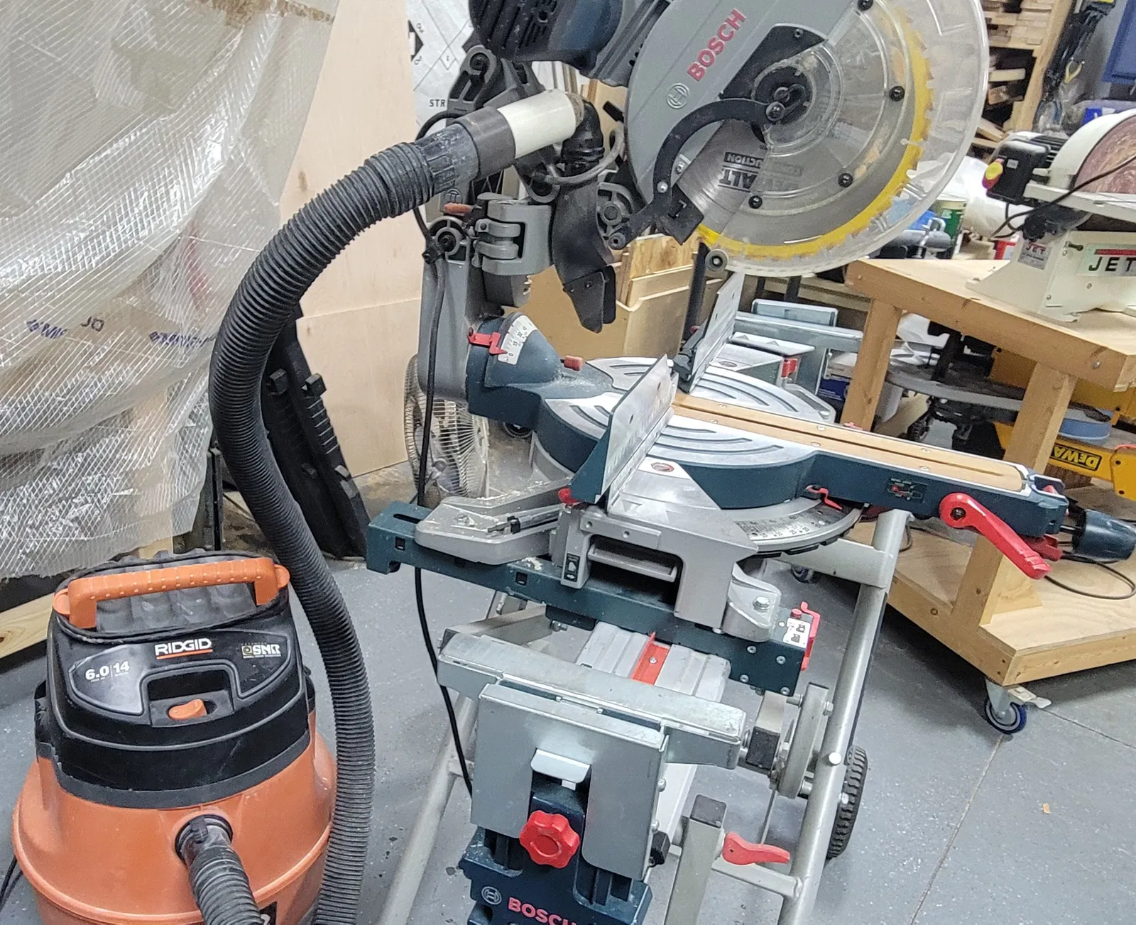 Máy cưa miter Bosch GCM12SD - Cái máy này có cái cổng hút bụi hơi kỳ cục mà tui chưa bao giờ thích và cũng chưa nối được cái gì vô đó một cách ổn định hết. Tui thiết kế mấy cái adapter để xử lý 2 trường hợp:
