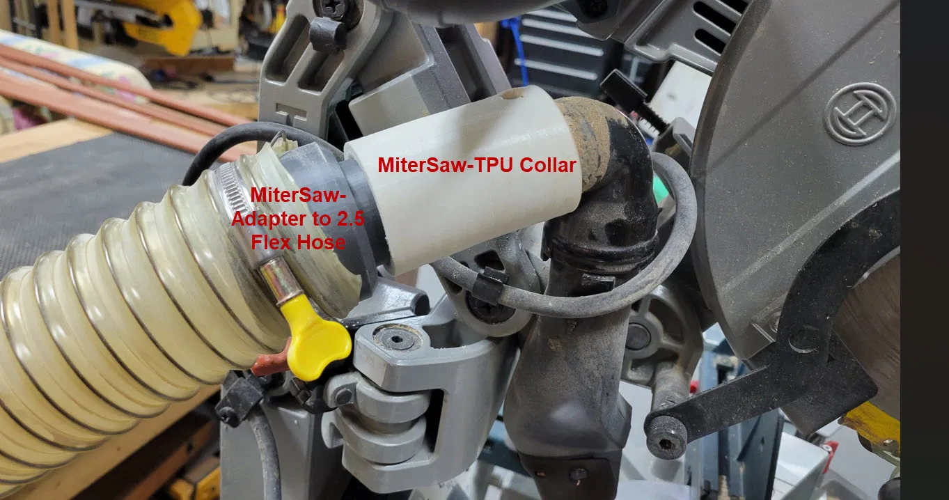 - In file “MiterSaw-Adapter to 2.5 Flex Hose.3mf”. Lại nữa, cái này cũng nhét vô cái TPU collar, và ống hút bụi mềm 2-1/2" sẽ gắn vô cái đầu lớn hơn, đủ chỗ để siết kẹp.