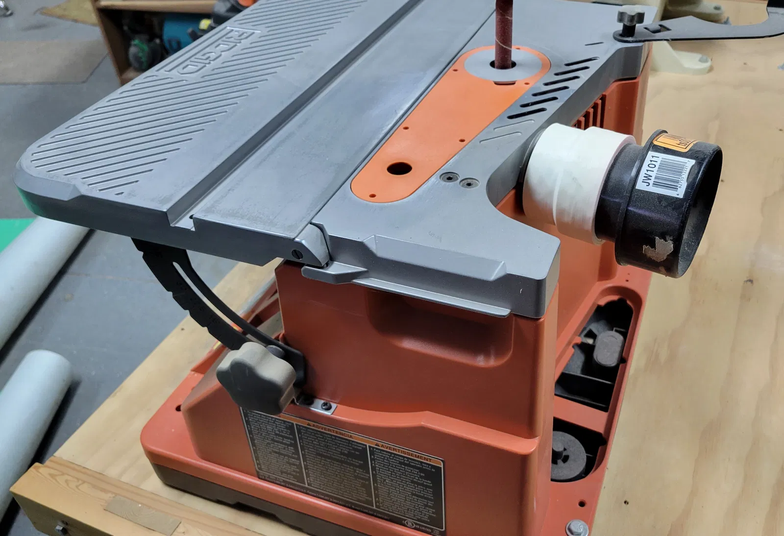 Máy chà nhám trục/vừa sọc Ridgid EB44242 - Tui có cái ống mềm 4" chạy từ cái blast gate và tình cờ có cái adapter 4" sang 3" mà tui mua hồi đó. Tui làm một cái TPU collar gắn khít vô cổng hút bụi trên máy chà nhám cũng như cái adapter 4" sang 3" đó.