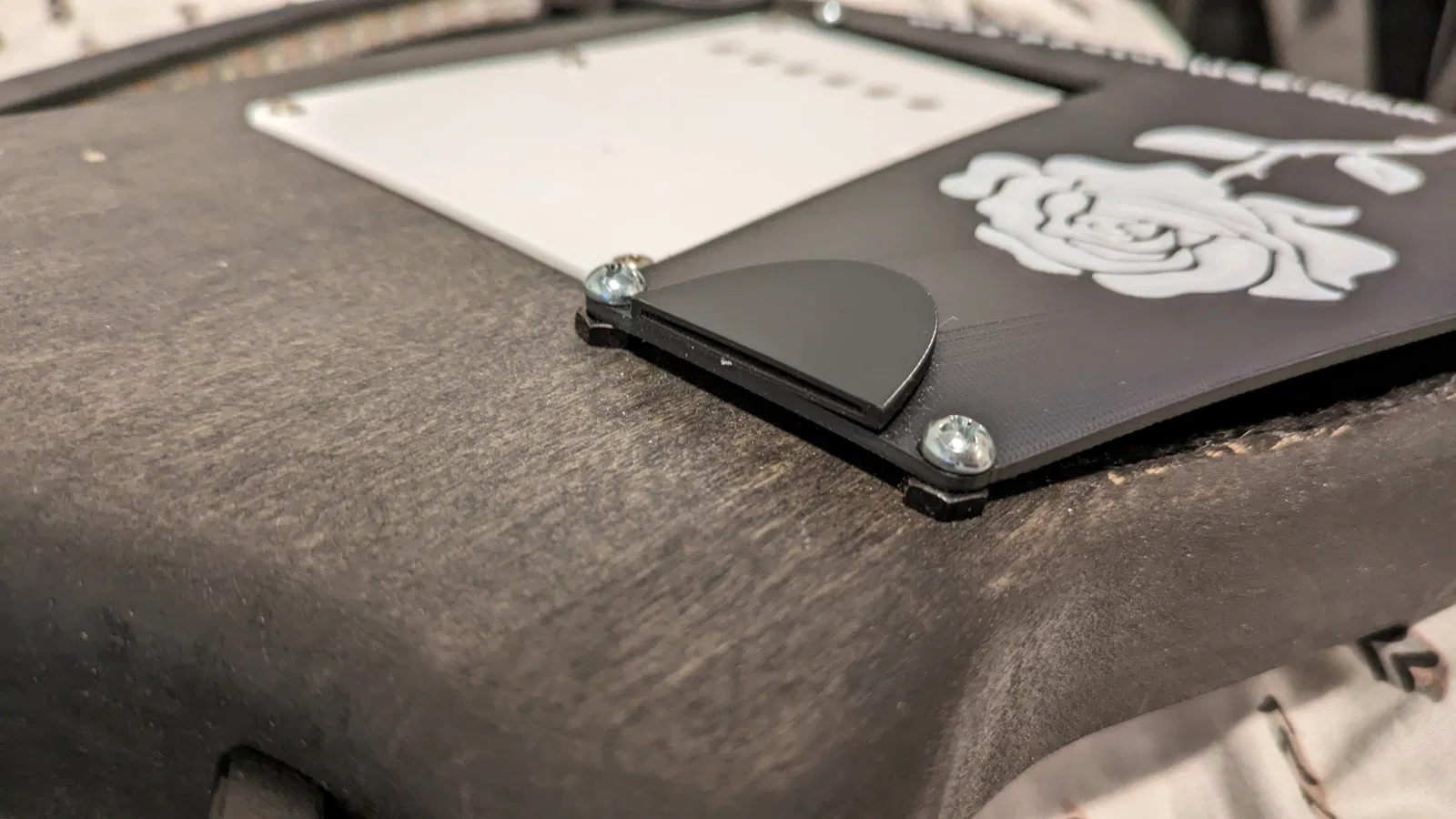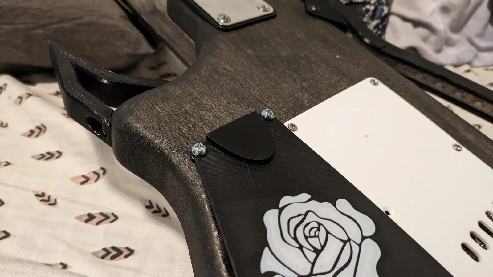 Để gắn lên đàn, bạn có thể dùng băng keo hai mặt hoặc keo dán. Nhưng nếu không muốn để lại vết trên đàn thì mình khuyên bạn nên sửa lại mẫu này theo cách khác, ví dụ như gắn vào mấy con ốc có sẵn trên đàn chẳng hạn.