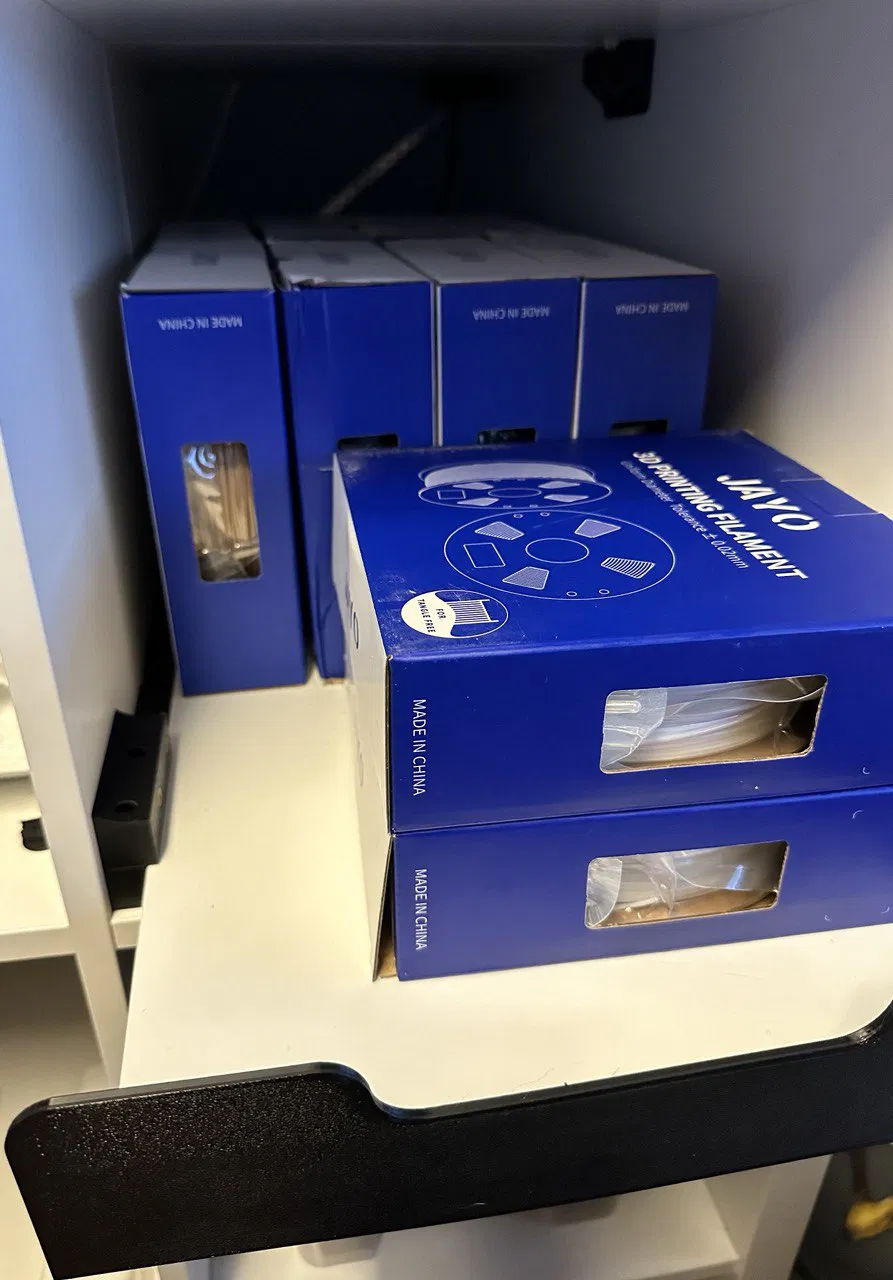Tao muốn tìm giải pháp để đựng filament trong bàn in của tao (hai kệ IKEA Kallax 4x3 đặt sát nhau). Đây là cái tao nghĩ ra, vì tao không muốn tốn nhiều tiền cho việc này. Cái kệ trượt trên các bộ phận in 3D.