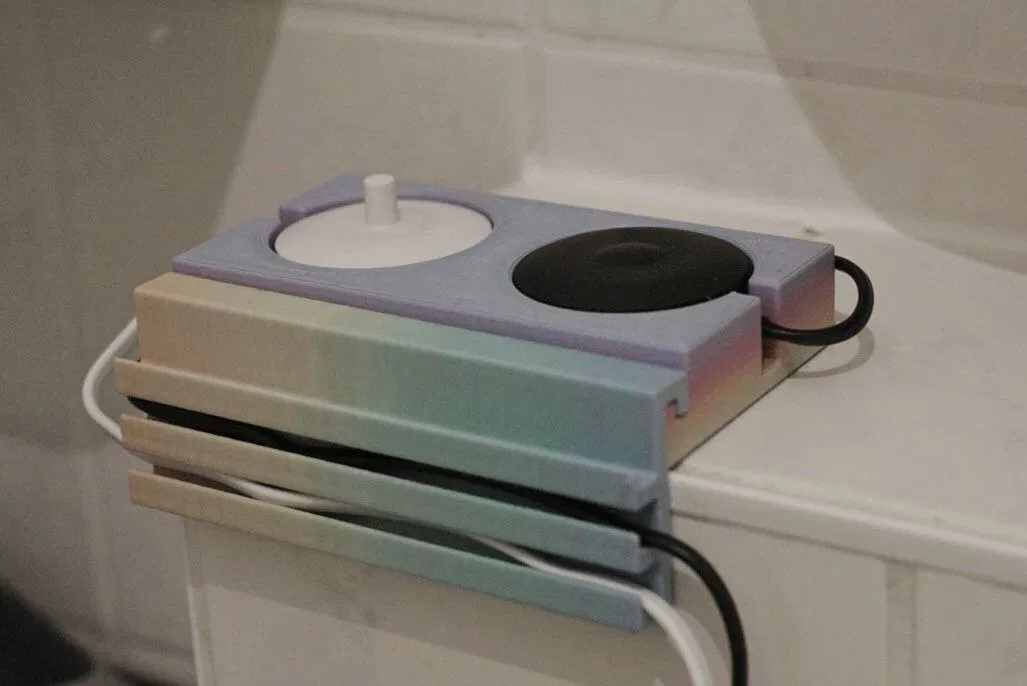 Tổ chức bàn chải điện Oral-B đôi và cáp của bạn với giá đỡ sáng tạo này. Thiết kế ép khớp giúp dễ dàng lắp đặt và kết nối chắc chắn, giữ cho cáp gọn gàng và tránh xa bồn rửa. In bằng PLA Pastel Cầu Vồng.
