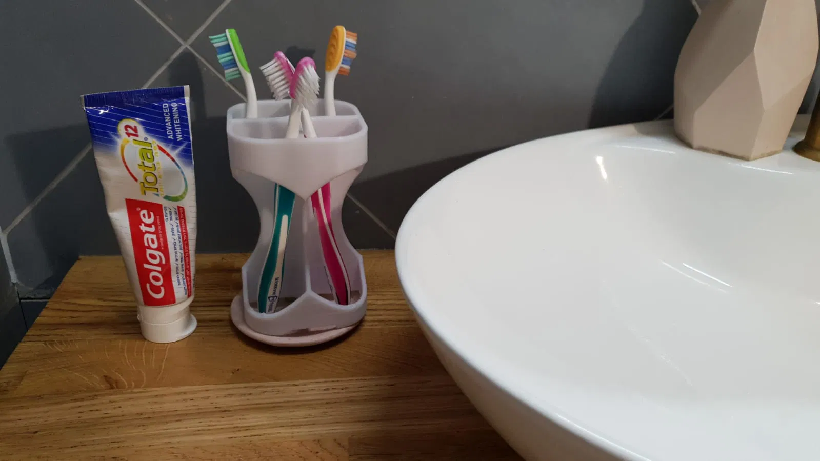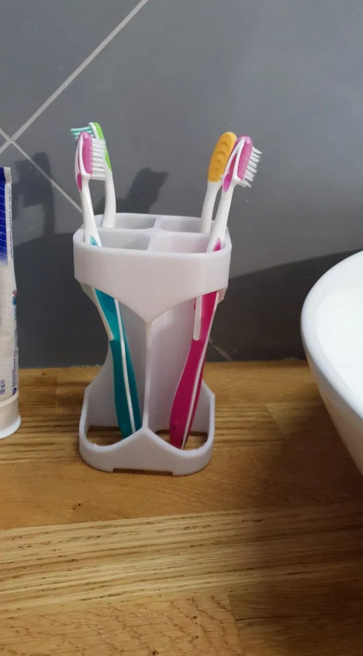 Kệ đựng bàn chải tối giản, đẹp mắt cho 4 cây, không cần in có support. Giúp giữ vệ sinh và khô ráo. Mẫu in thử thách, nên in chậm và dùng brim.