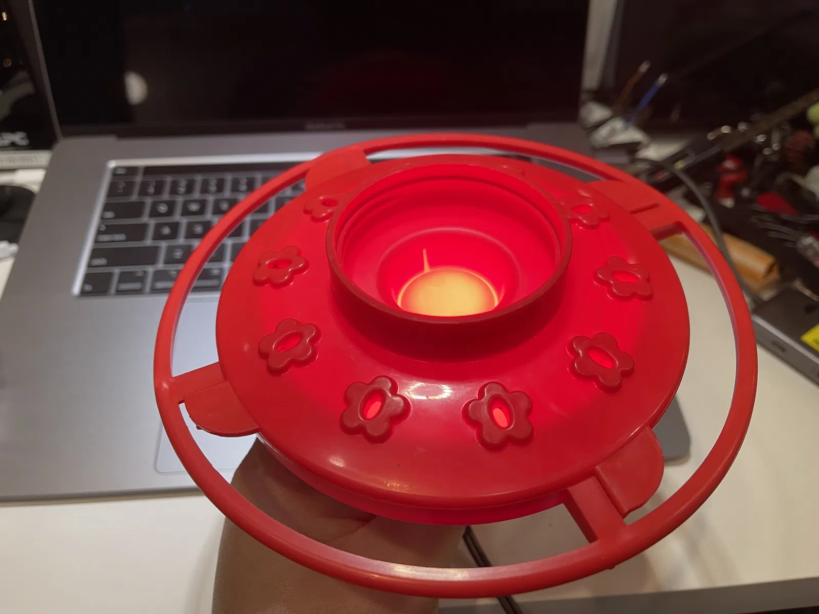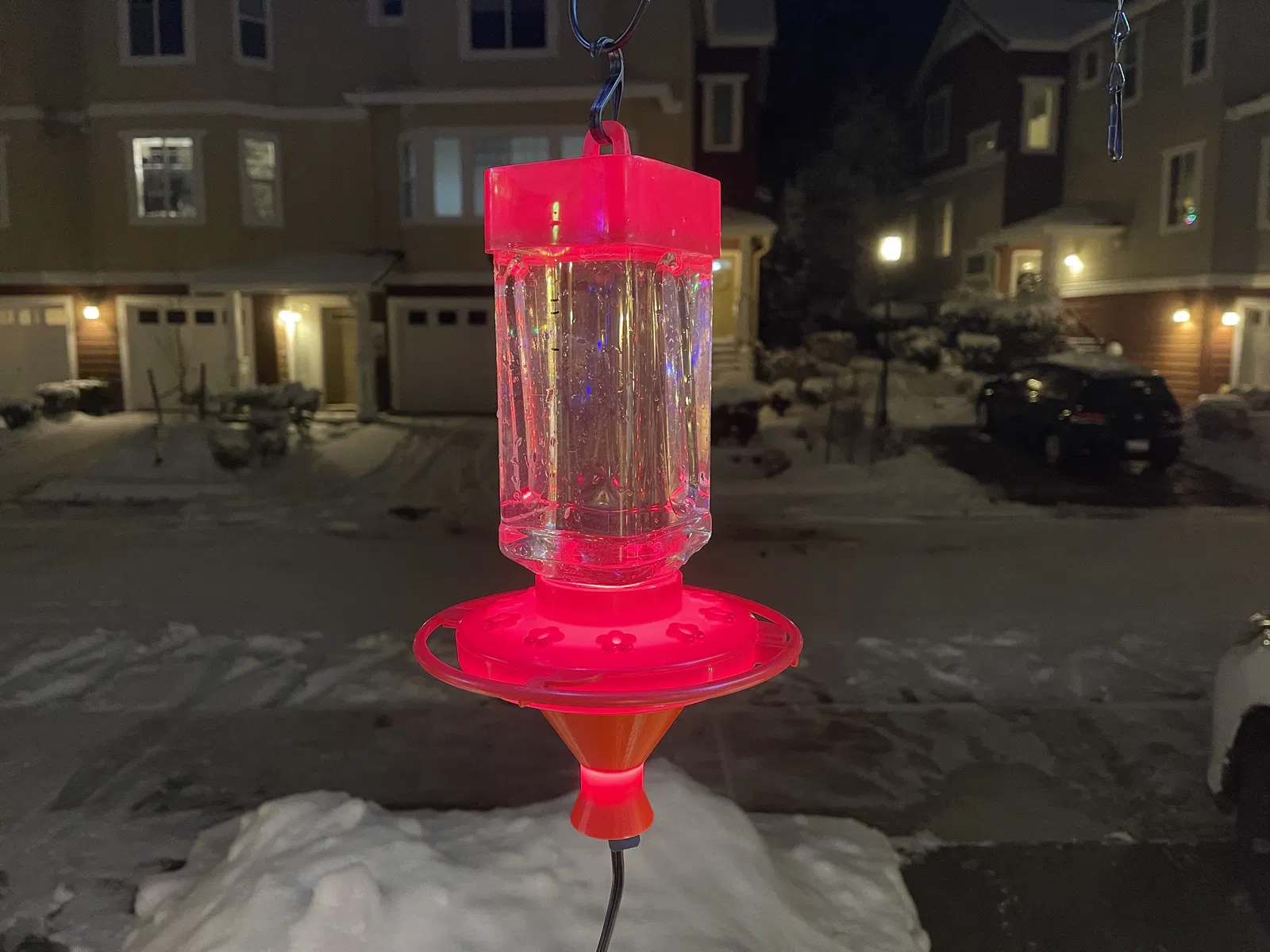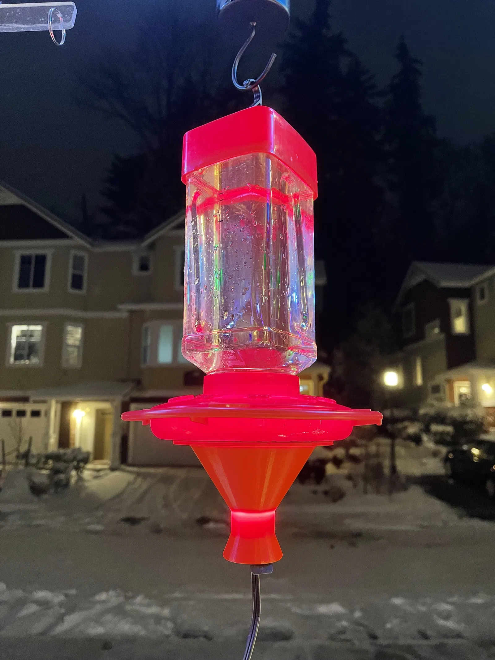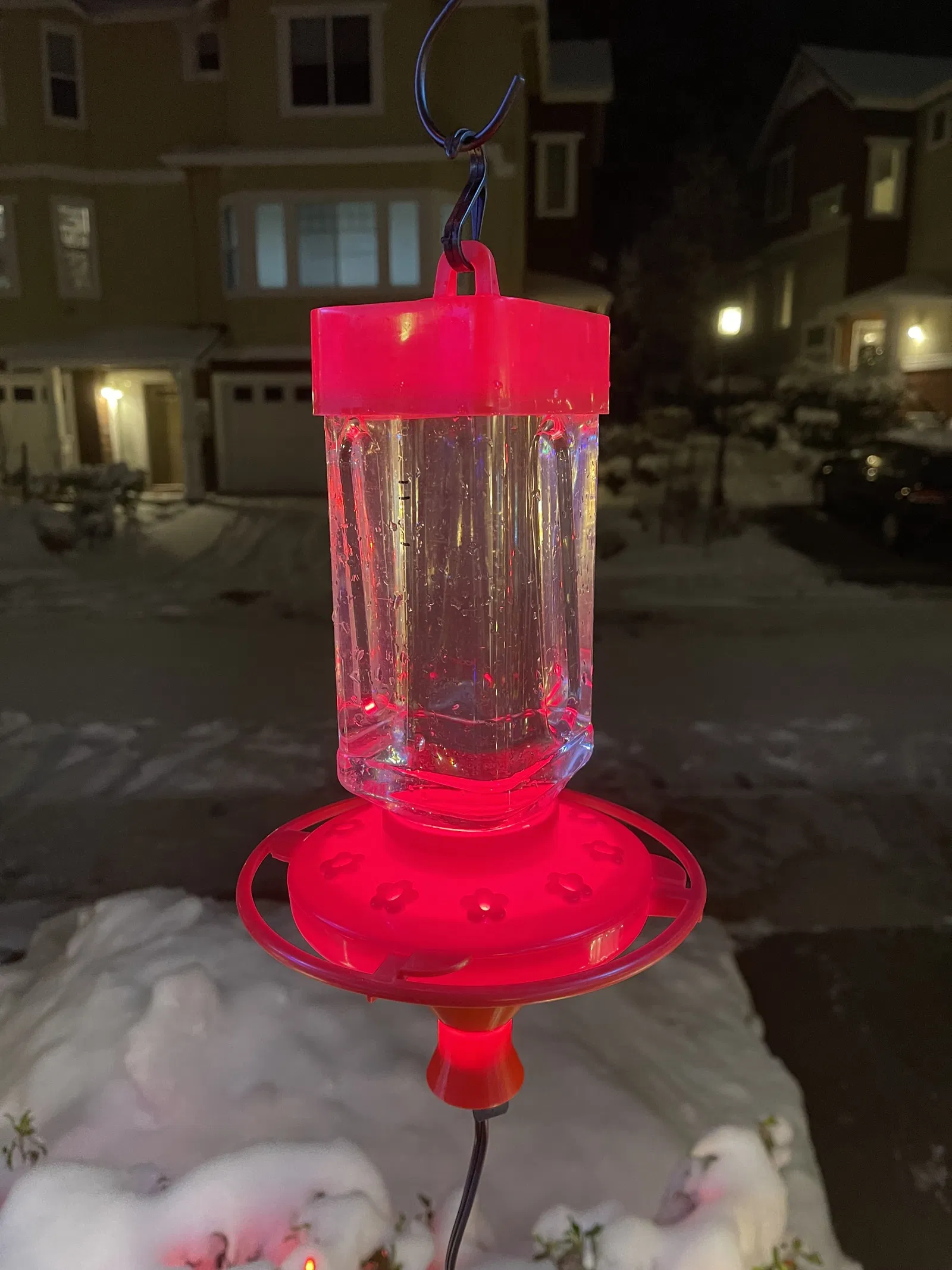 Nếu ngay cả điều này cũng không thể ngăn nước nectar đóng băng, thì cuối cùng có bóng đèn sợi đốt 25W để sử dụng, nhưng bạn cần để ý nhiệt độ nước nectar, nó có thể trở nên khá ấm, những gì chúng ta đang cố gắng đạt được là không làm đóng băng nước nectar, chắc chắn không cố gắng nấu nước nectar, nước nectar nhiệt độ cao có thể rất có hại cho chim ruồi.