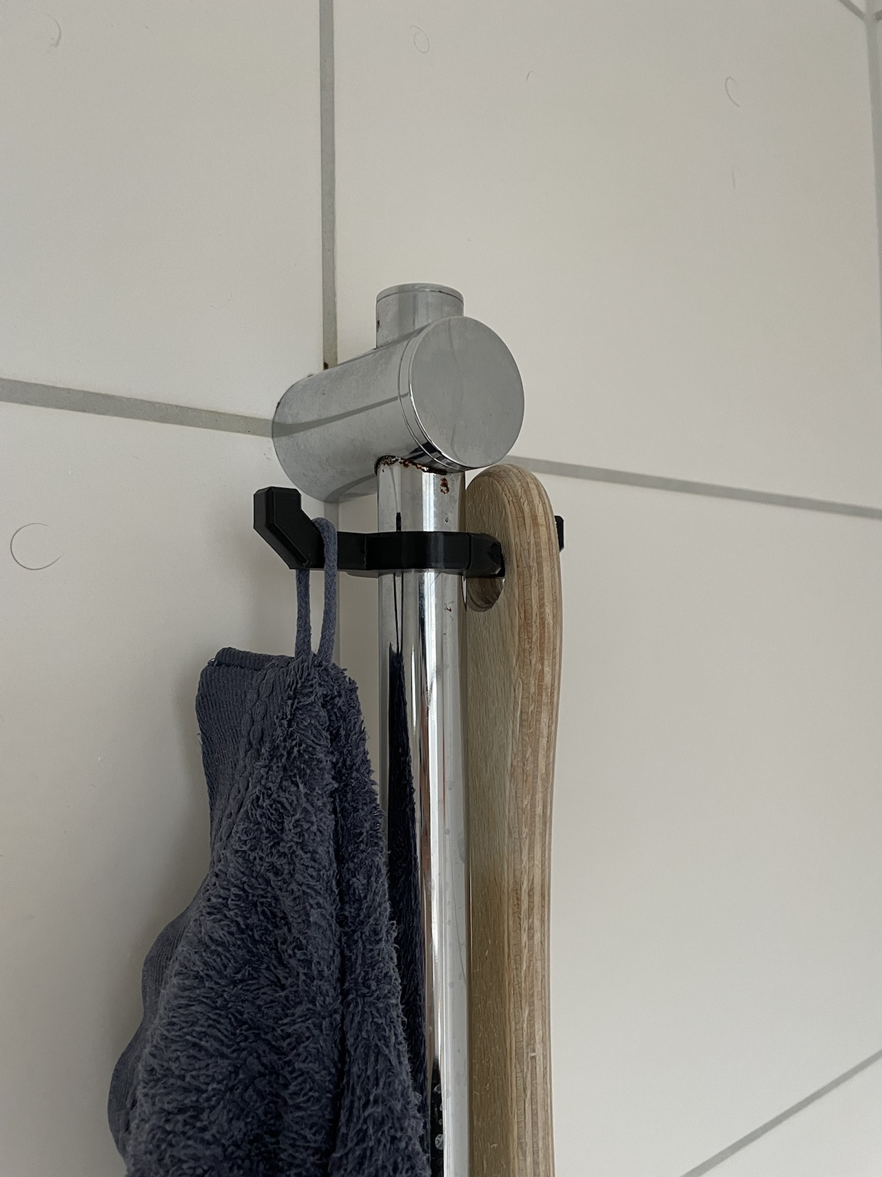 Cách đơn giản để thêm 2 cái móc treo đồ để hong khô đồ đạc trong bồn tắm hoặc phòng tắm sen. Sau khi in xong, bạn chỉ cần vài con vít gỗ loại 3 x 12 hoặc 3 x 16 mm để kẹp chặt cái này quanh thanh treo phòng tắm 25mm.