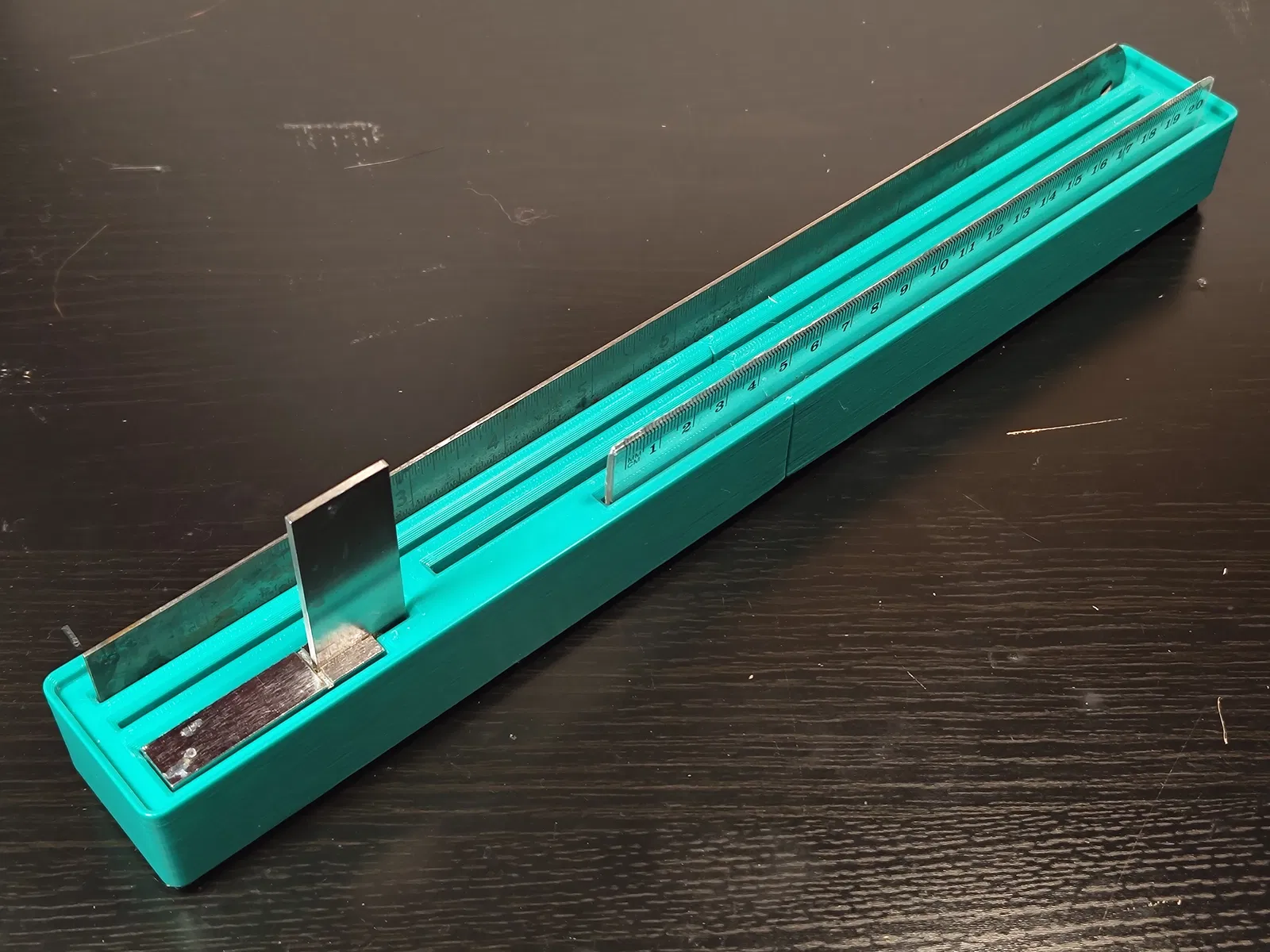 Hộp đựng Gridfinity này có thể chứa tối đa bốn cây thước với các kích cỡ khác nhau (318mm, 248mm, 208mm) và một thước vuông kỹ sư mini. Thiết kế chiếm 8x1 Gridfinity, có thể cần chia đôi để in, với chốt nối đi kèm. Dùng PLA và "tai chuột" để in dễ dàng hơn.