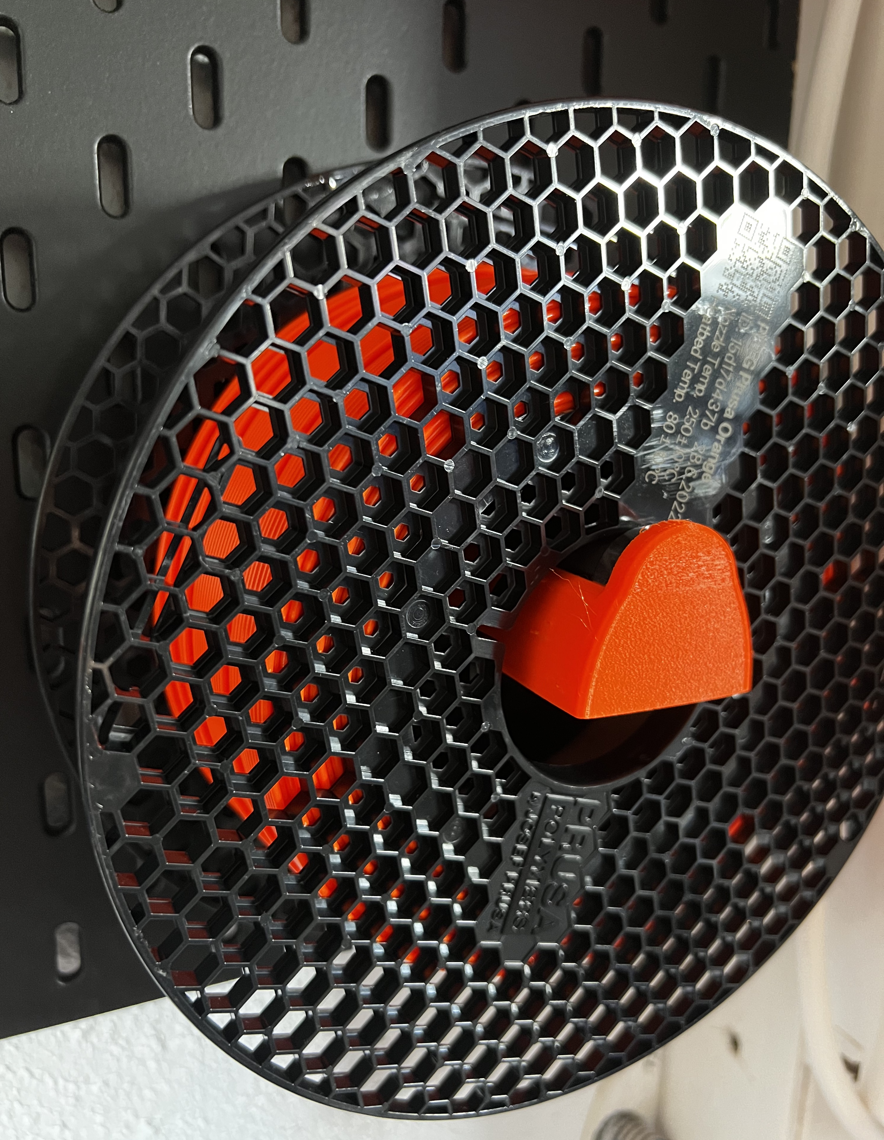 Cái giá đỡ này để xài cho bảng Ikea Skadis nè, dùng bạc đạn cho quay mượt mà, đựng cuộn chỉ 1kg. Ae in PLA/PETG, lớp 0.2mm, đổ đầy 10%, nhớ để support nha.