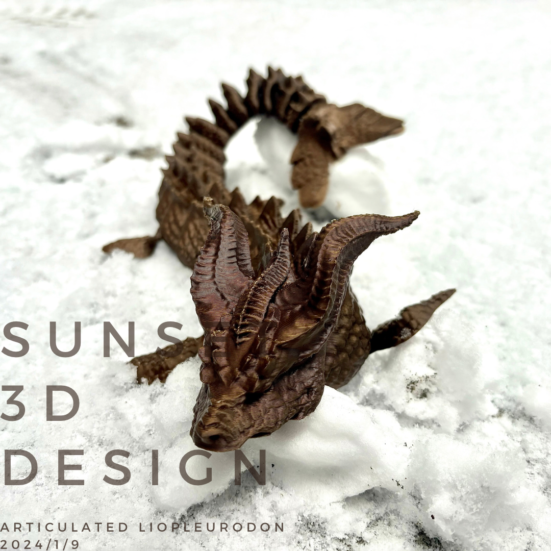 Mô hình khủng long Liopleurodon có khớp nối, với các khớp nối linh hoạt cho phép tạo dáng. Phiên bản in thử nghiệm ở tỉ lệ 100% cho kết quả xuất sắc. Khuyến nghị dùng 10% infill để tăng độ cứng cáp. Cài đặt in chi tiết cho PRUSA I3 MK3S kèm theo.