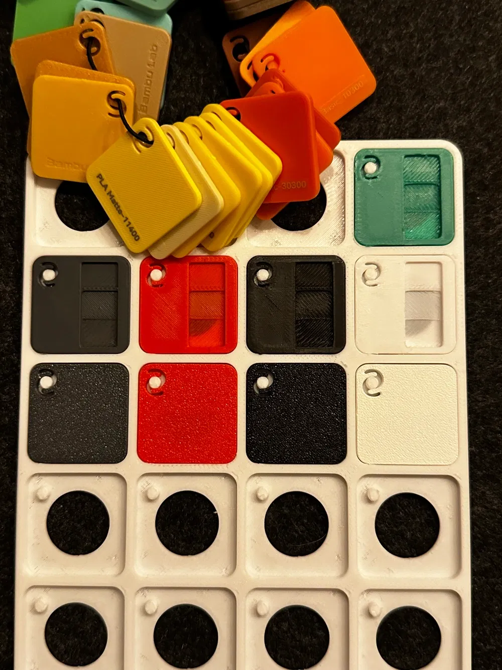Tui làm lại cái Bambu Swatch để kiểm tra độ trong suốt của sợi filament với các độ dày khác nhau: 0.2, 0.4, 1.0 và 2.0 mm. In được 4 mẫu cùng lúc bằng 1 AMS, vừa hết các khe giữ đồ có sẵn trên Makerworld.