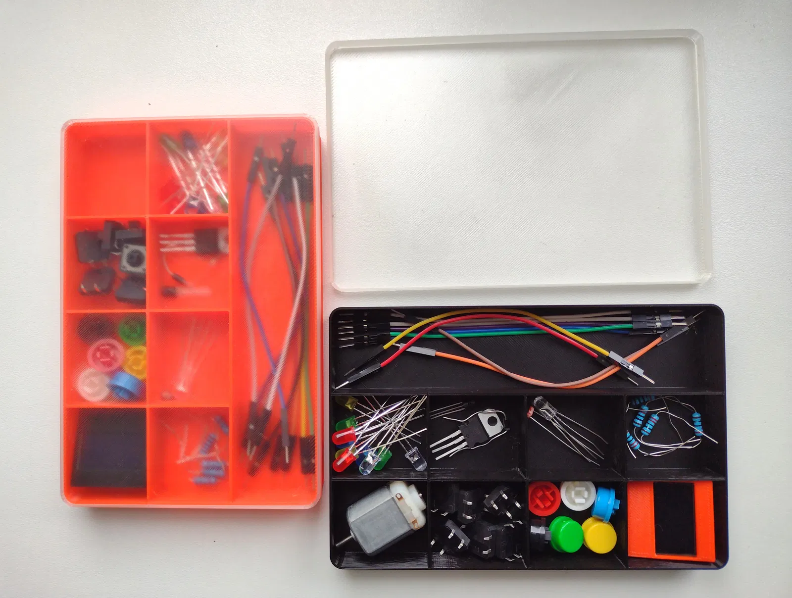 Hộp - ngăn đựng đồ cho các linh kiện điện tử cơ bản (màn hình, dây nối, điện trở, transistor, đèn LED,...). Hộp gồm 2 phần, nắp hộp trông rất đẹp khi in bằng sợi nhựa trong suốt. Có 2 phiên bản, một phiên bản trong hơn và một phiên bản cứng cáp hơn.