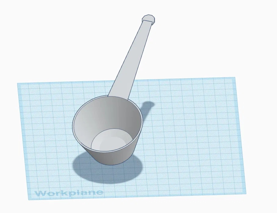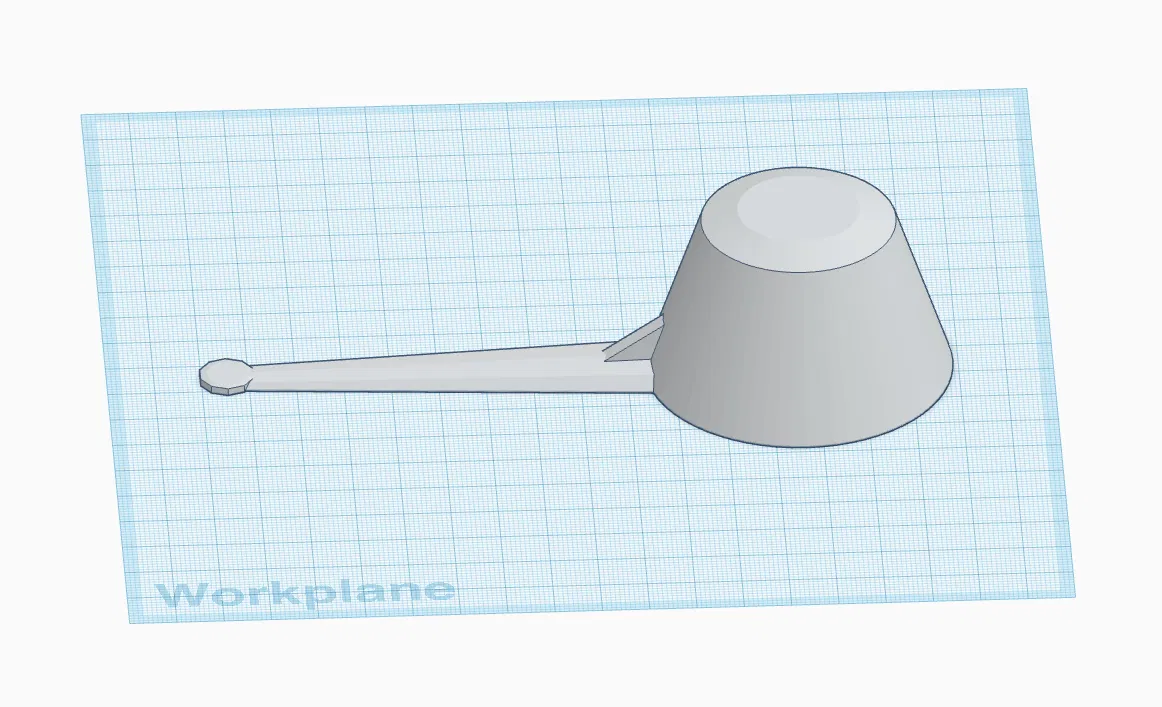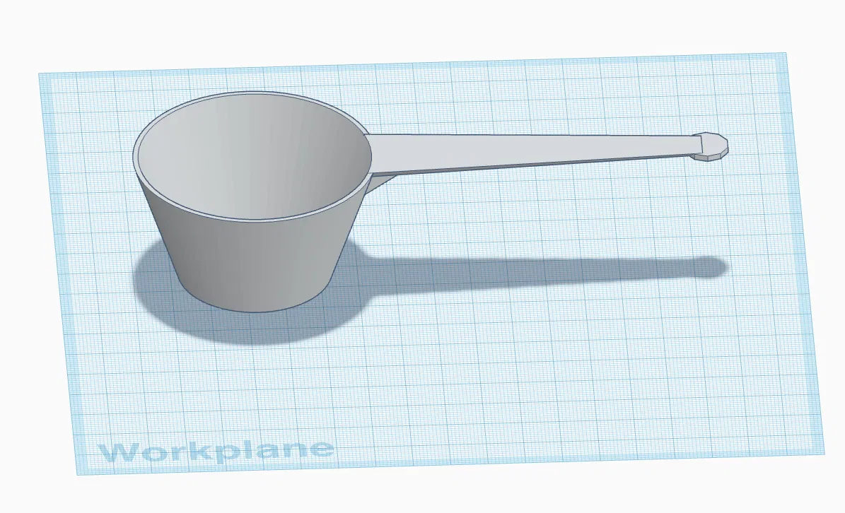 Một cái muỗng đong khoảng 0.8 Deciliters có tay cầm dài hơn. Đây là lượng thức ăn cho chó chính xác mà tui cho con cún của tui ăn mỗi bữa, và nó giúp tui thò tay vào thùng thức ăn cho cún dễ hơn một chút.