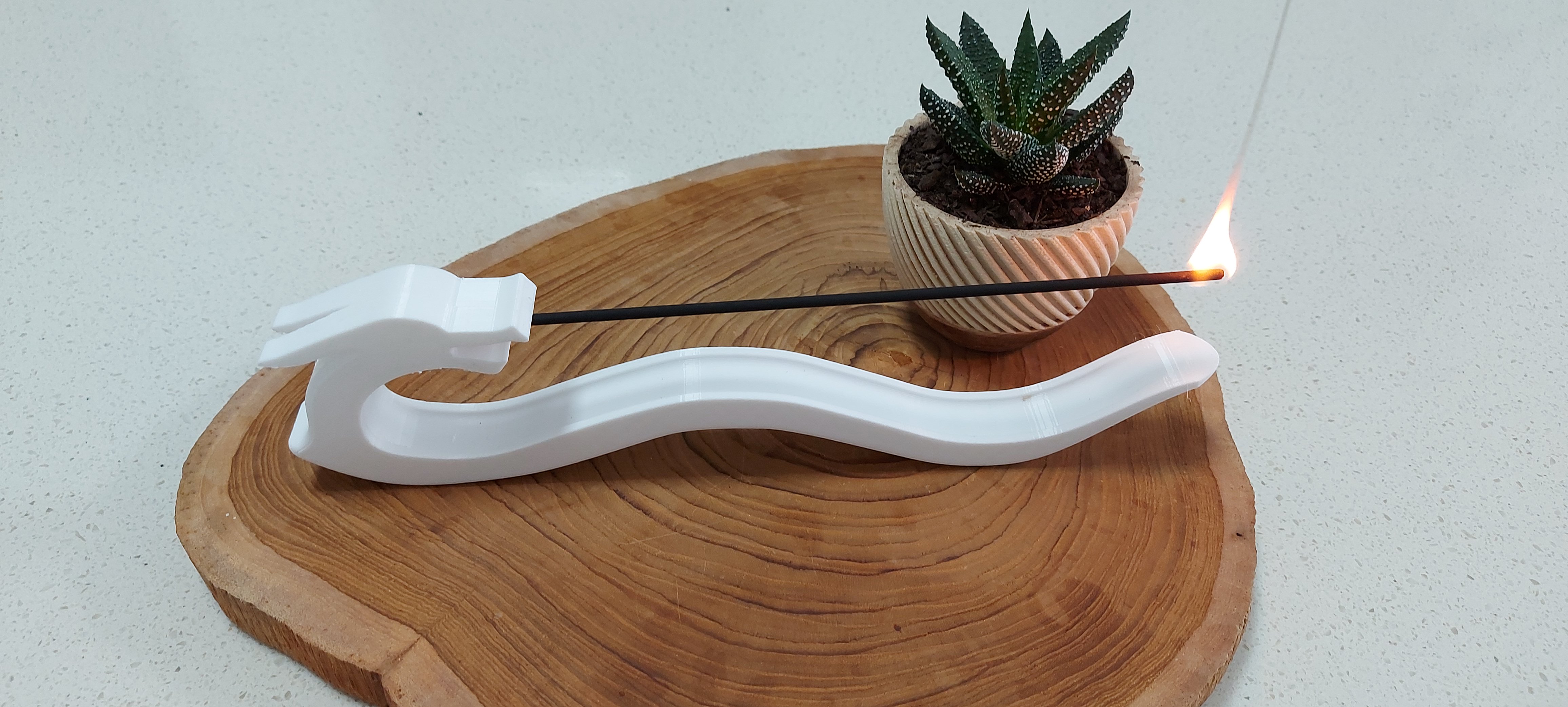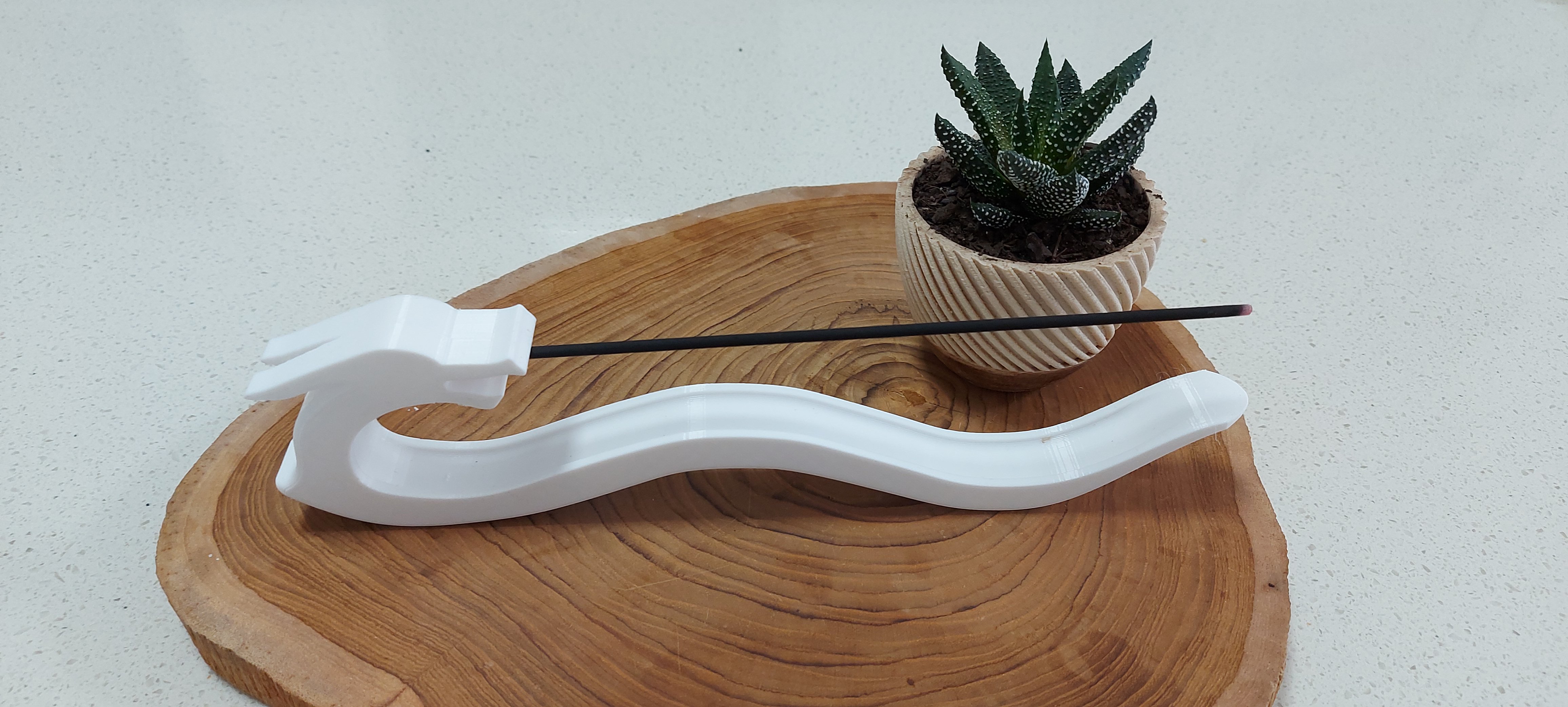 A design of a dragon/snake with an incense stick held in its mouth. The body is designed to catch the burnt stick.