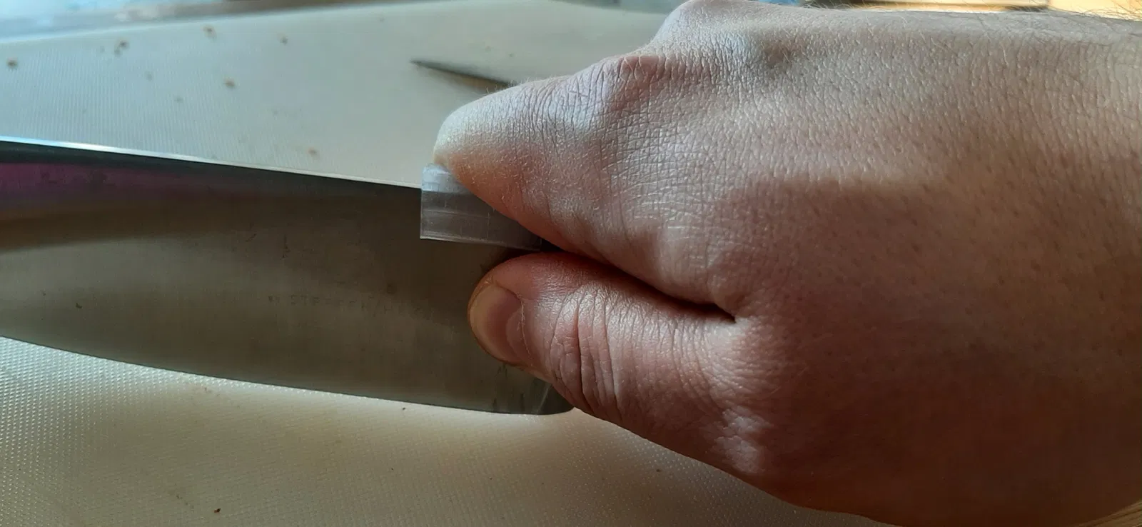 Tui làm cái đồ trợ giúp đơn giản này vì tui bị phồng rộp ngón trỏ hoài khi cắt nhiều đồ. Khi xài "chef grip", cái cạnh trên nó bén lắm.
