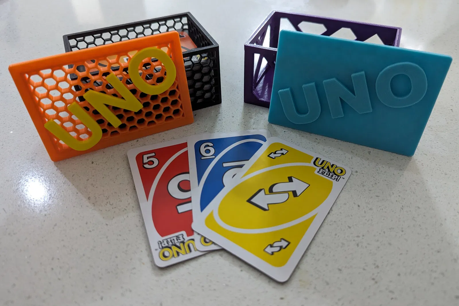 Mấy cái hộp đựng bài Uno này để cất giữ mấy lá bài Uno quý giá của bạn nè. Bạn có thể tùy ý phối mấy cái nắp với đáy với nhau. Cái nắp tổ ong có thể in rời các chữ cái, gắn vô là dính, khỏi cần keo.