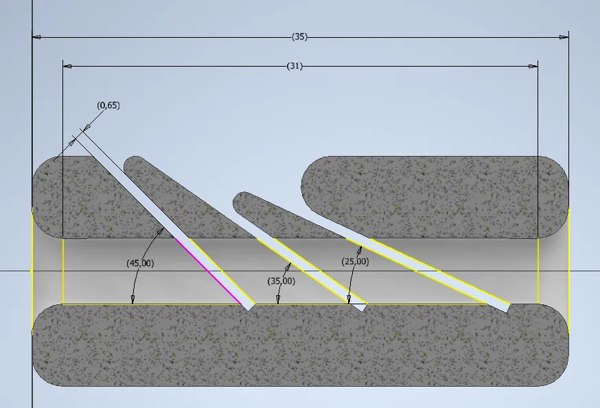 Cái này là một cái jig cắt sợi nhựa đơn giản thôi. Anh em cần nhét một đoạn ống PTFE dài 30mm, đường kính ngoài 4mm vô trước khi xài nha. Nó có 3 góc: 45, 35, 25 độ. Mình thiết kế nó dựa trên lưỡi dao rọc giấy 0.5mm đó.