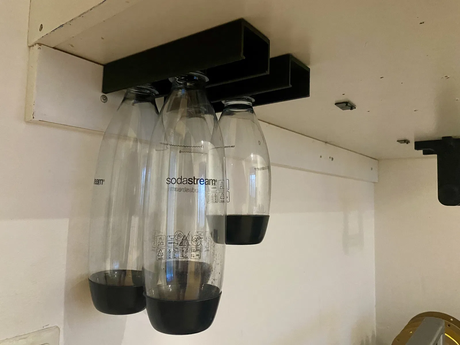 Tức mình vì mấy chai Sodastream cứ hay bị ngã, hoặc không xếp gọn gàng được hả? Cái này giải quyết được vấn đề đó, giúp bạn treo mấy chai nước lên. Mỗi chai Sodastream đều có cái vành, bạn sẽ móc chai vào đó.
