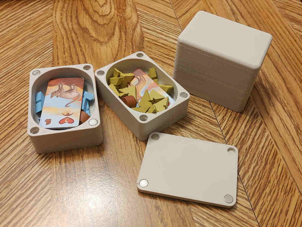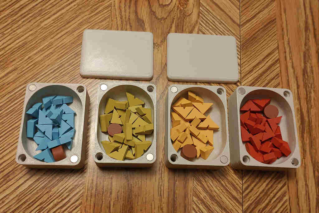 Hộp đựng người chơi có nam châm, có thể xếp chồng lên nhau cho board game Near and Far. Thiết kế này giúp bạn sắp xếp các quân cờ gọn gàng và dễ dàng sử dụng với nam châm. Bạn cần in 4 hộp và 2 nắp để vừa với organizer.