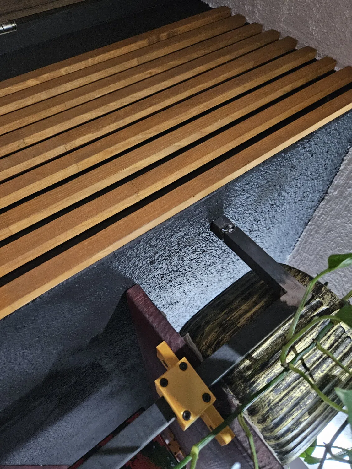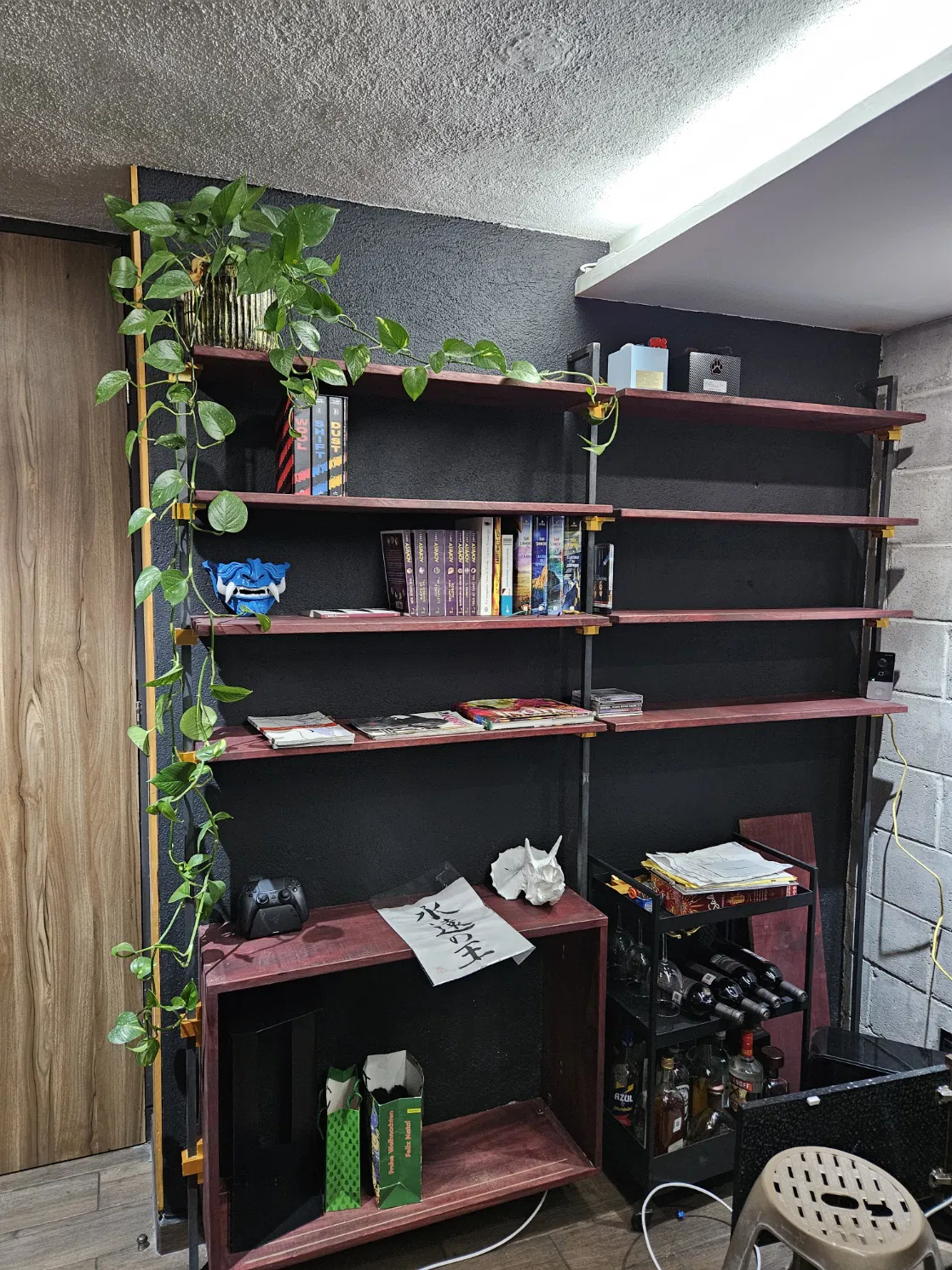 Đây là một dự án kết hợp nhiều vật liệu, khung kim loại chắc chắn làm bằng thanh sắt L- ¾ (làm theo yêu cầu), cố định vào tường và hàn chết.
