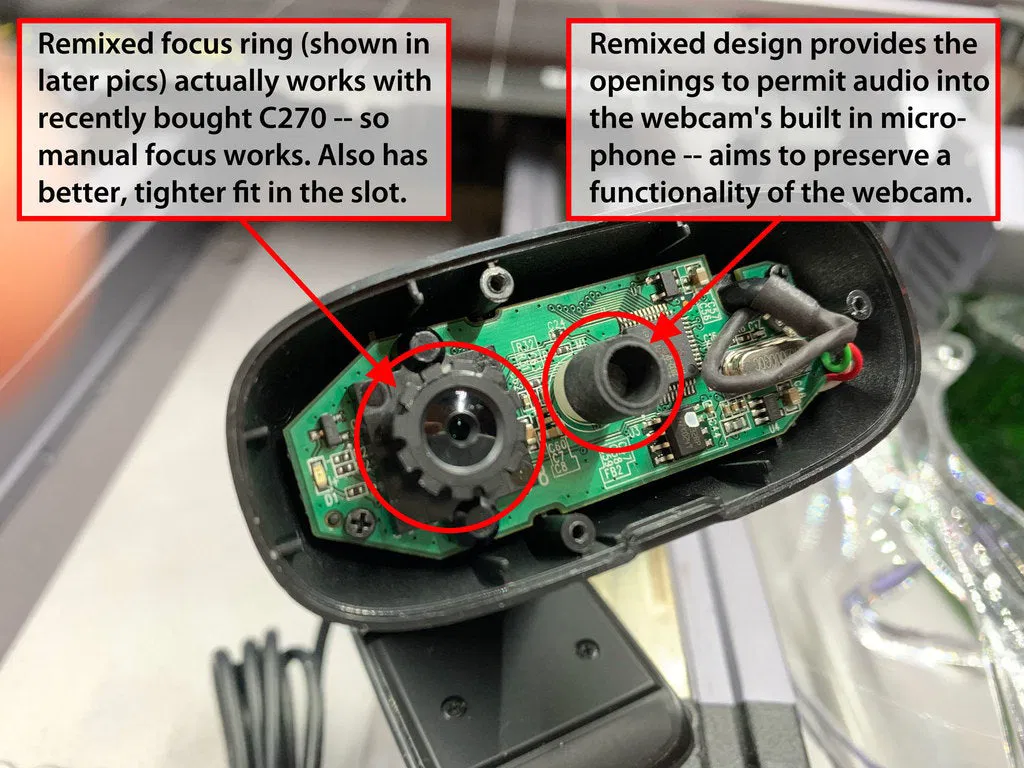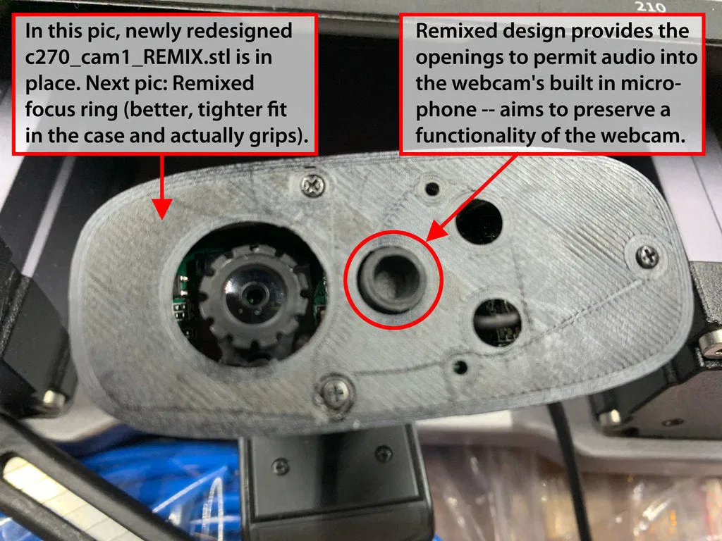 - Thiết kế gốc không có lỗ nào cho phép âm thanh lọt vào micro tích hợp của webcam, cái này chắc không quan trọng với đa số ảnh tua nhanh 3D print, nhưng cho phép âm thanh vào thì chẳng tốn gì thêm ngoài sự suy tính, và cho phép nó có thể hỗ trợ/giữ nguyên chức năng gốc của webcam có thể hữu ích hoặc cần thiết vào một lúc nào đó. Bản remix của mình có lỗ ở đúng vị trí để âm thanh có thể tới được micro.