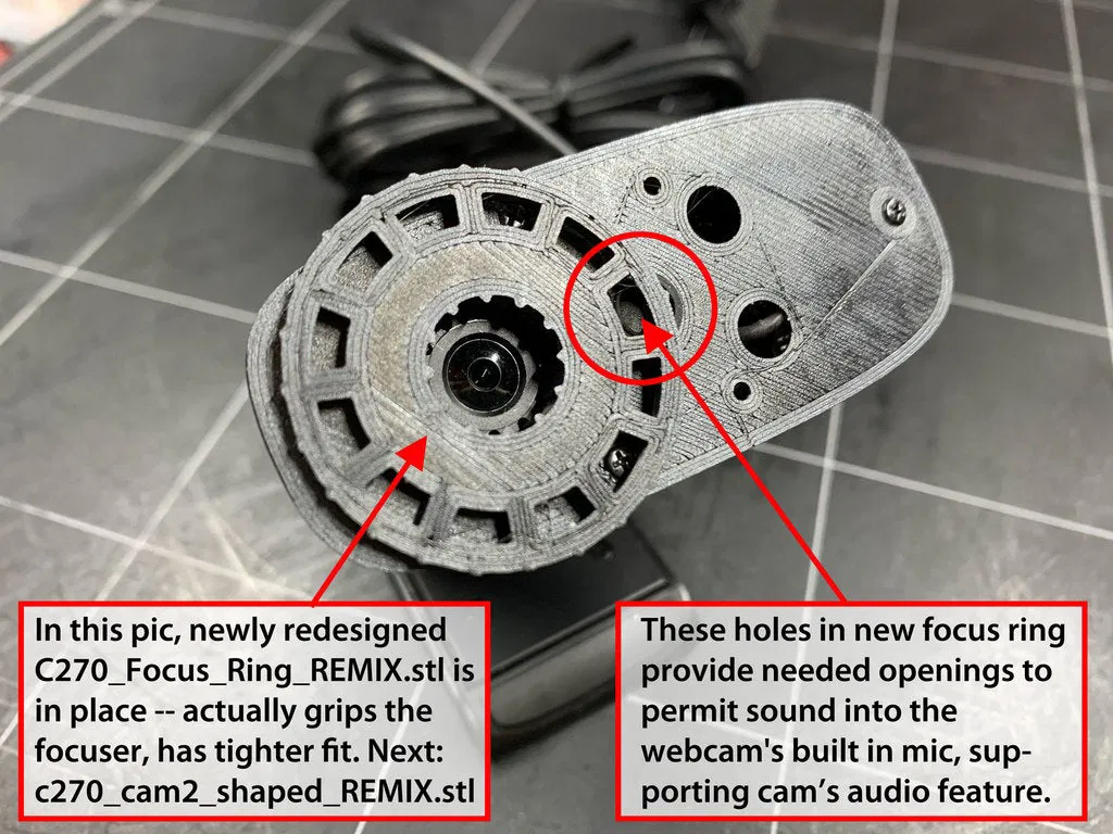 - Cái "c270_cam2_shaped.stl" gốc của luc_e có một cái lỗ cho cái đĩa vòng lấy nét cao 3.3 mm mà cái đĩa đó chỉ có 2.0 mm. Khoảng hở quá nhiều, dẫn đến bị lắc lư.