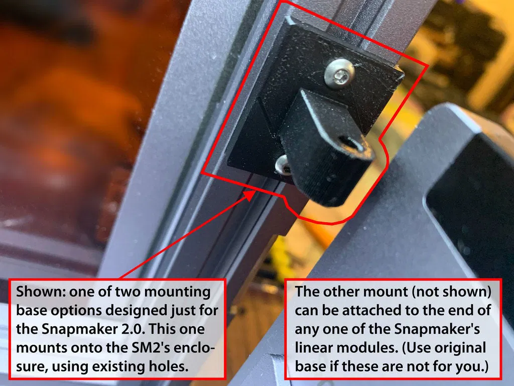 - Thiết kế gốc chỉ có tùy chọn đế có trọng lượng (thiết kế để đặt đâu đó chứ không phải để gắn vào khung hoặc vỏ máy). Do không gian hạn chế nên mình muốn gắn vào vỏ máy Snapmaker 2.0 của mình. Ai muốn đế tự do, có trọng lượng, thì có trong thiết kế gốc. Mình cung cấp, trong bản remix này, hai tùy chọn đế gắn được thiết kế đặc biệt cho Snapmaker 2.0. Một cái gắn vào vỏ máy SM2, dùng mấy lỗ ren có sẵn trên thanh dọc gần màn hình cảm ứng (nếu bạn gắn màn hình cảm ứng đúng như hướng dẫn) — đây là thanh có cảm biến cửa, mà cả hai cánh cửa đều hút nam châm vào đó. Cái đế còn lại có thể gắn vào đầu bất kỳ module tuyến tính nào của Snapmaker.