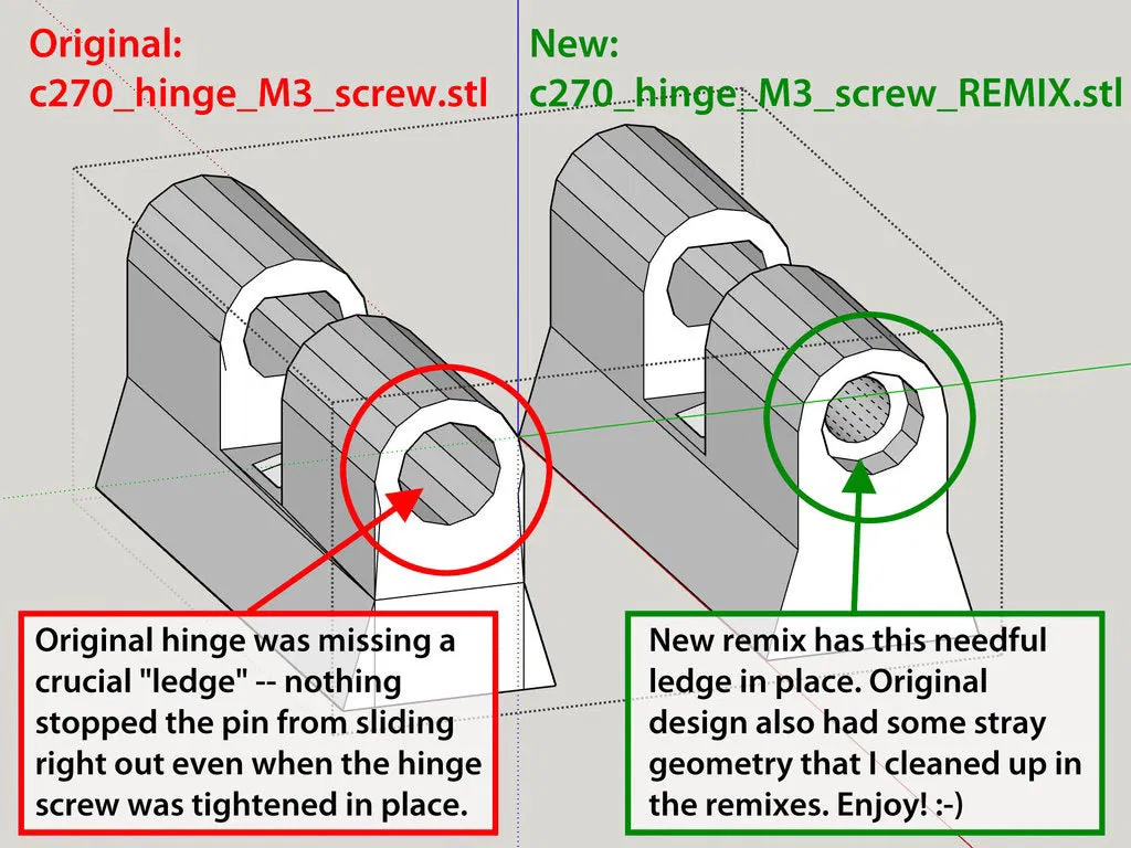 - Cái vòng lấy nét gốc nó không bám được vô bộ phận lấy nét của con C270 của mình, mà cái bản remix của biomushroom sau này cũng vậy luôn, dù luc_e có khuyên dùng. Chắc cái model C270 của mình nó hơi khác hả? * Cái "c270_hinge_M3_screw.stl" gốc nó thiếu một cái chỗ thắt eo quan trọng cho lỗ trục (như nhìn thấy trong bộ phận gắn webcam gốc). Cái mép của nó phải tạo thành một cái gờ bên trong để đầu ốc có thể tì vào đó. Không có cái "mép" này, không có gì ngăn được cái chốt trượt ra ngoài ngay cả khi con ốc gắn bản lề đã siết chặt.