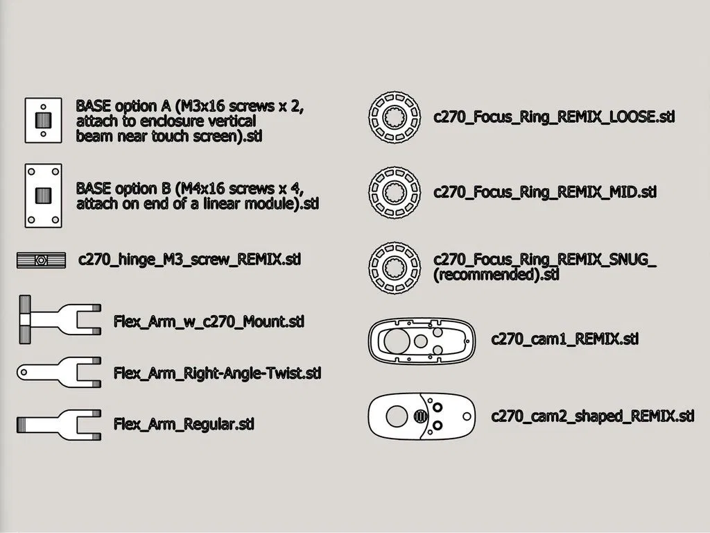 - TÙY CHỌN TAY NỐI (ghép tùy thích): Flex_Arm_Regular — ốc M3x20 và đai ốc tương ứng Flex_Arm_Right-Angle_Twist — ốc M3x20 và đai ốc tương ứng * Flex_Arm_w_c270Mount — ốc M3x20 và đai ốc tương ứng LƯU Ý:_ Cái tùy chọn cuối cùng ("Flex_Arm_w_c270Mount") làkhông xài_ trong mấy tấm hình nha. Nó sẽ loại bỏ sự cần thiết của bộ phận "c270_hinge_REMIX", nhưng đổi lại sẽ bị giảm bớt khả năng điều chỉnh (xoay). Mấy lý do mà mình phải làm lại mấy món này nè...