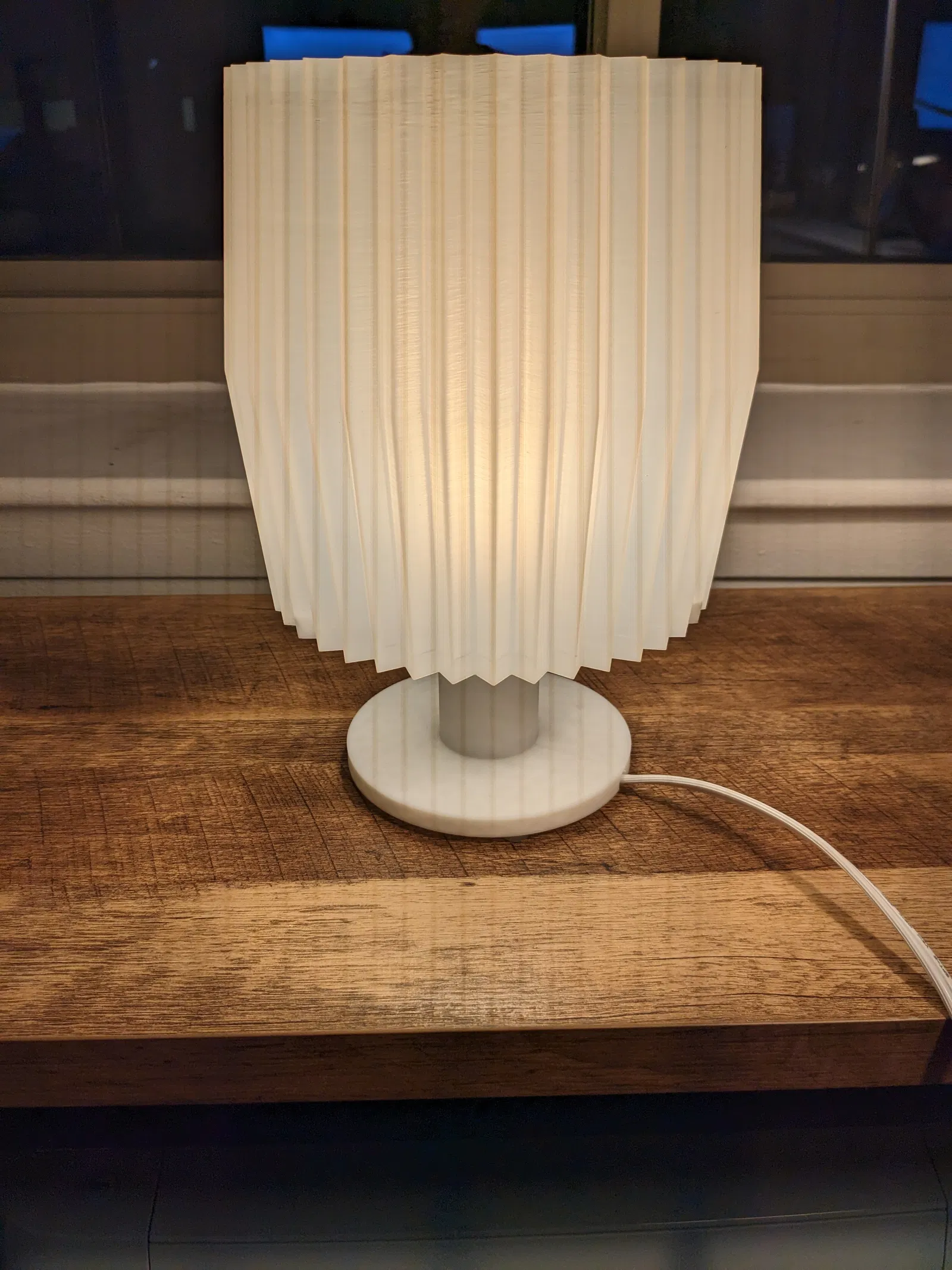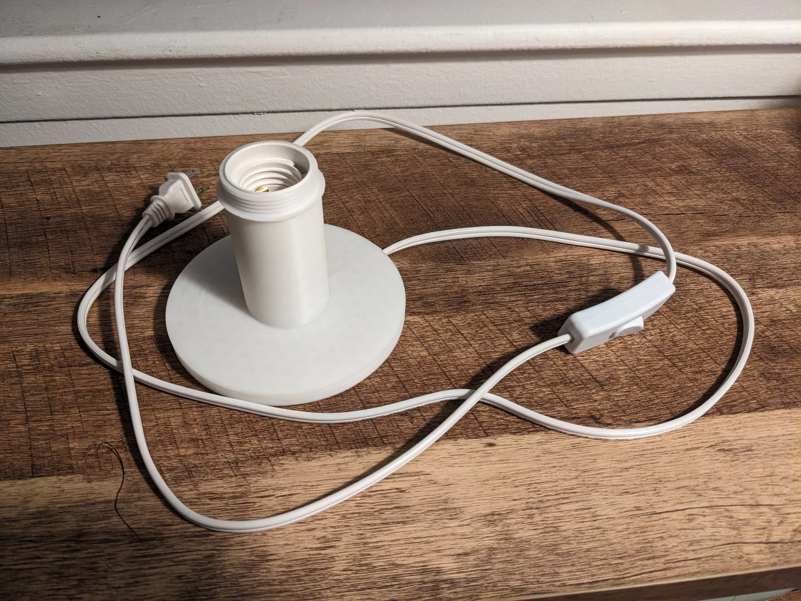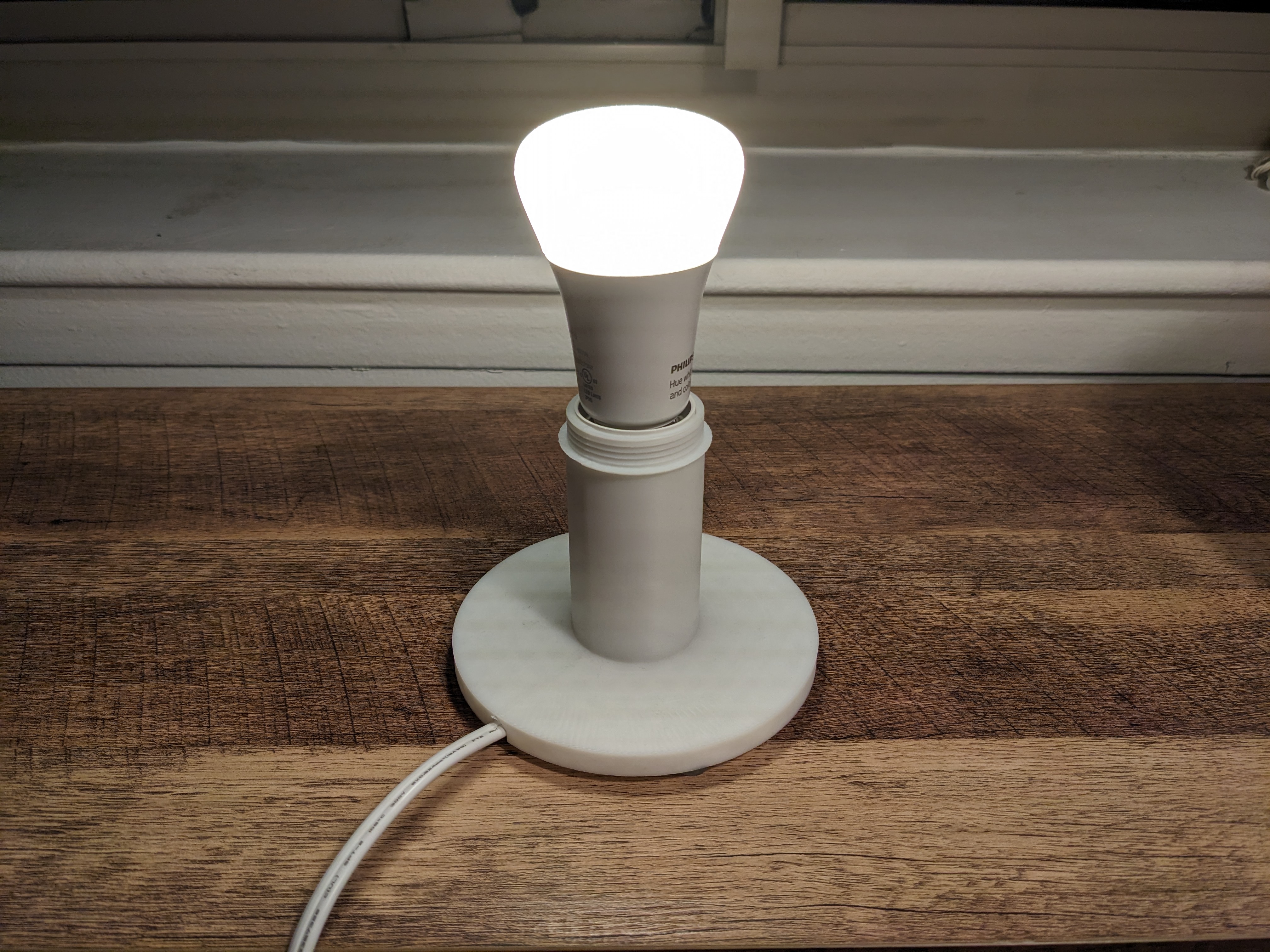 Tao muốn làm cái đèn thiệt rẻ. Thiết kế này xài dây đèn lồng treo có sẵn trên Amazon, vừa túi tiền, rồi luồn qua cái đế đèn. Cái đế có mấy cái chốt giữ đui đèn để nó không xoay lung tung.