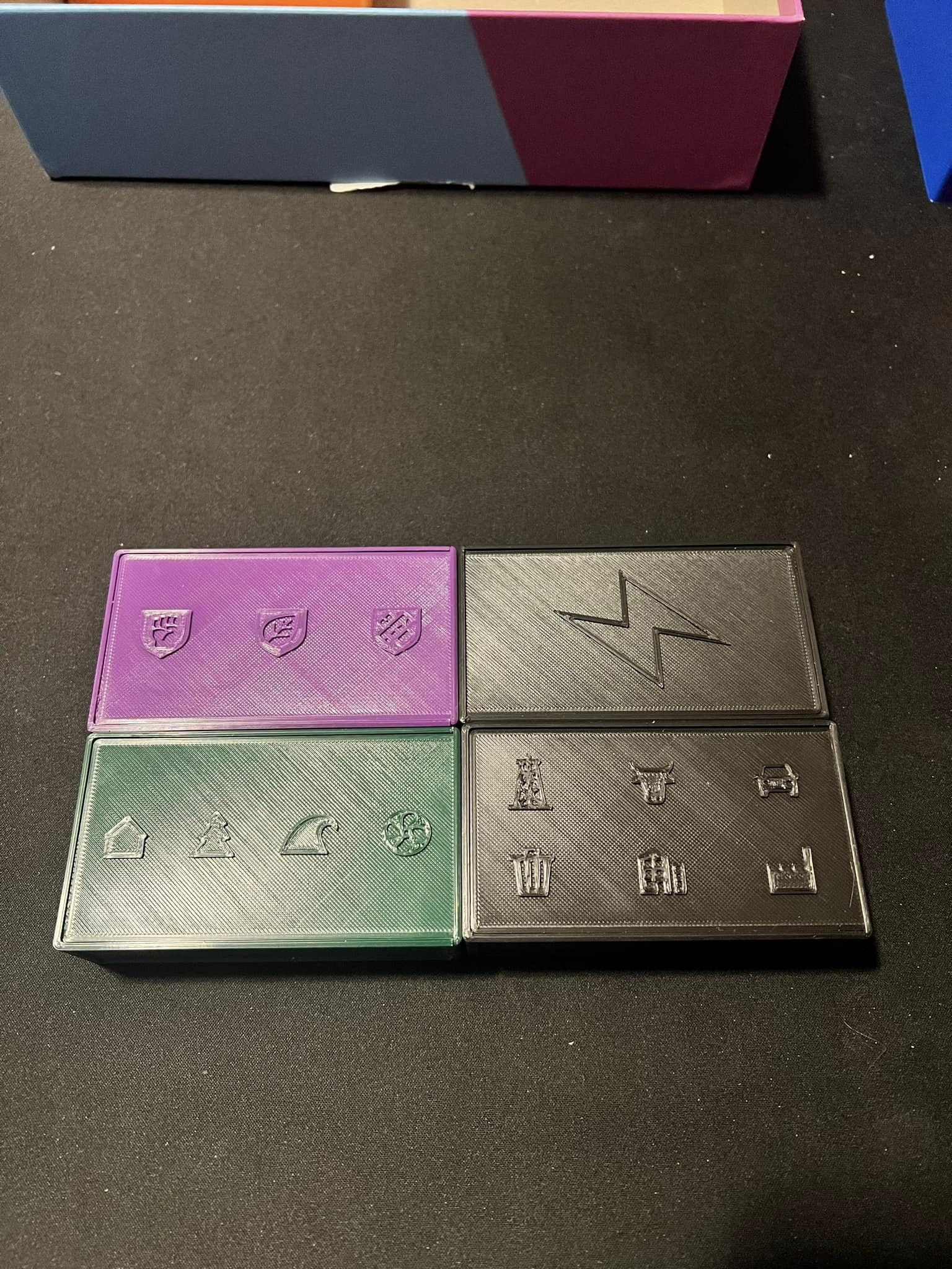 Hộp đựng Token và Nắp - Mỗi hộp có bố cục khác nhau để chứa các bộ phận của chúng, nắp cũng đóng vai trò như một hướng dẫn về những gì sẽ được cho vào từng phần. Dung sai rất chặt, nếu tôi nhận được cái nào quá chặt, tôi chỉ cần lấy giấy nhám chà một lần ở hai bên và thử lại. Tôi chỉ lặp lại cho đến khi nó trượt mượt mà. Bạn sẽ nghe thấy tiếng click khi đóng nó.