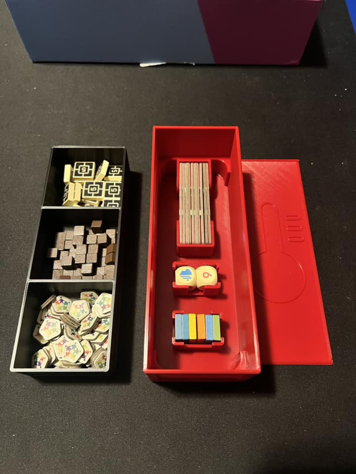 Hộp Khủng hoảng/Hộp lồng vào nhau/Nắp Khủng hoảng - Phần lồng vào nhau chứa các token carbon và Community in Crisis. Phần chính chứa xúc xắc, dải nhiệt độ và các thẻ đánh dấu bằng gỗ Planetary Effects.