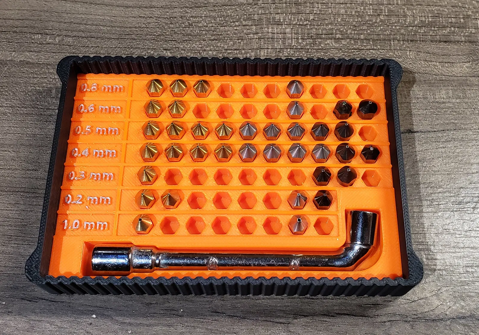 Hộp có nắp và khay tháo rời để đựng đầu phun và cờ lê, in bằng PLA. Làm cho phù hợp với Hộp mẫu Filament.