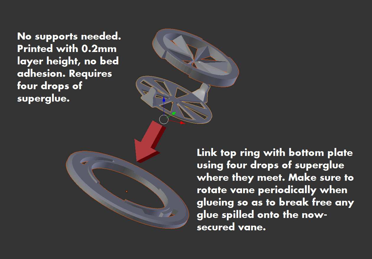 Ba bộ phận, không cần hỗ trợ hoặc keo dán đáy. Kết nối với bốn giọt keo siêu dính (superglue).
