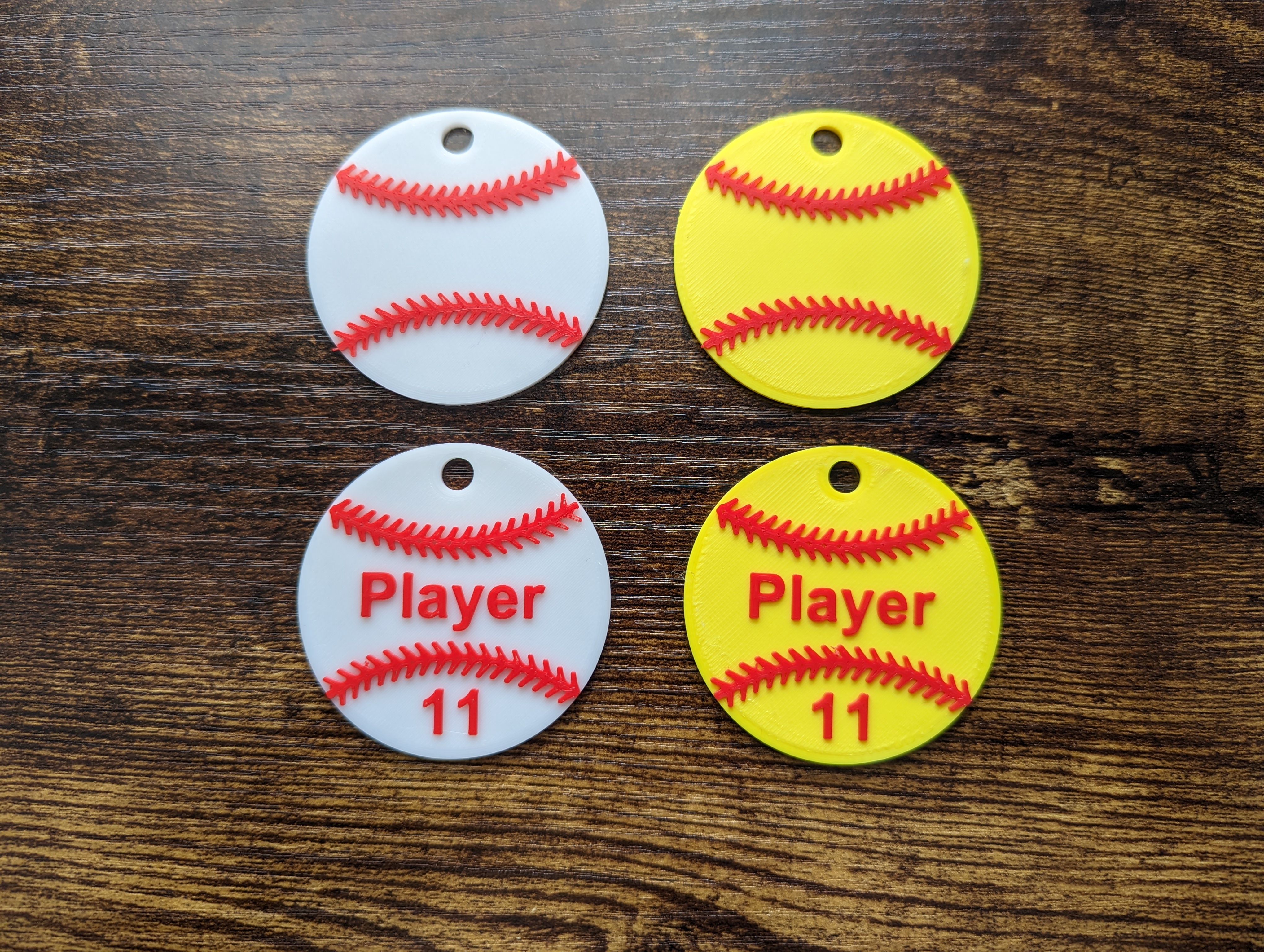 Móc khóa tùy chỉnh. Bạn có thể thêm tên và số của cầu thủ. Tôi đã làm cái này cho mấy đứa con gái và chúng nó thích lắm. Có thể làm bằng màu bóng chày hoặc bóng mềm. Chỉ cần đổi màu khi bắt đầu in phần chỉ khâu là sẽ đẹp.