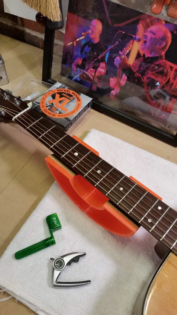 Giá đỡ cần đàn guitar giúp giữ đàn chắc chắn khi bạn sửa chữa. Thiết kế này được tối ưu hóa để tiết kiệm nhựa và thời gian in, có thể tùy chỉnh kích thước dễ dàng bằng OpenSCAD. Phù hợp cho cả guitar điện và acoustic.