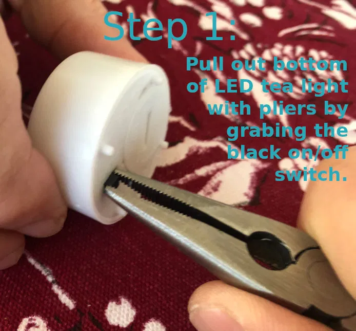 Bước 1: Dùng kìm giữ phần đáy của đèn trà LED (cầm vào nút gạt màu đen) và kéo cho đến khi phần đáy bật ra.