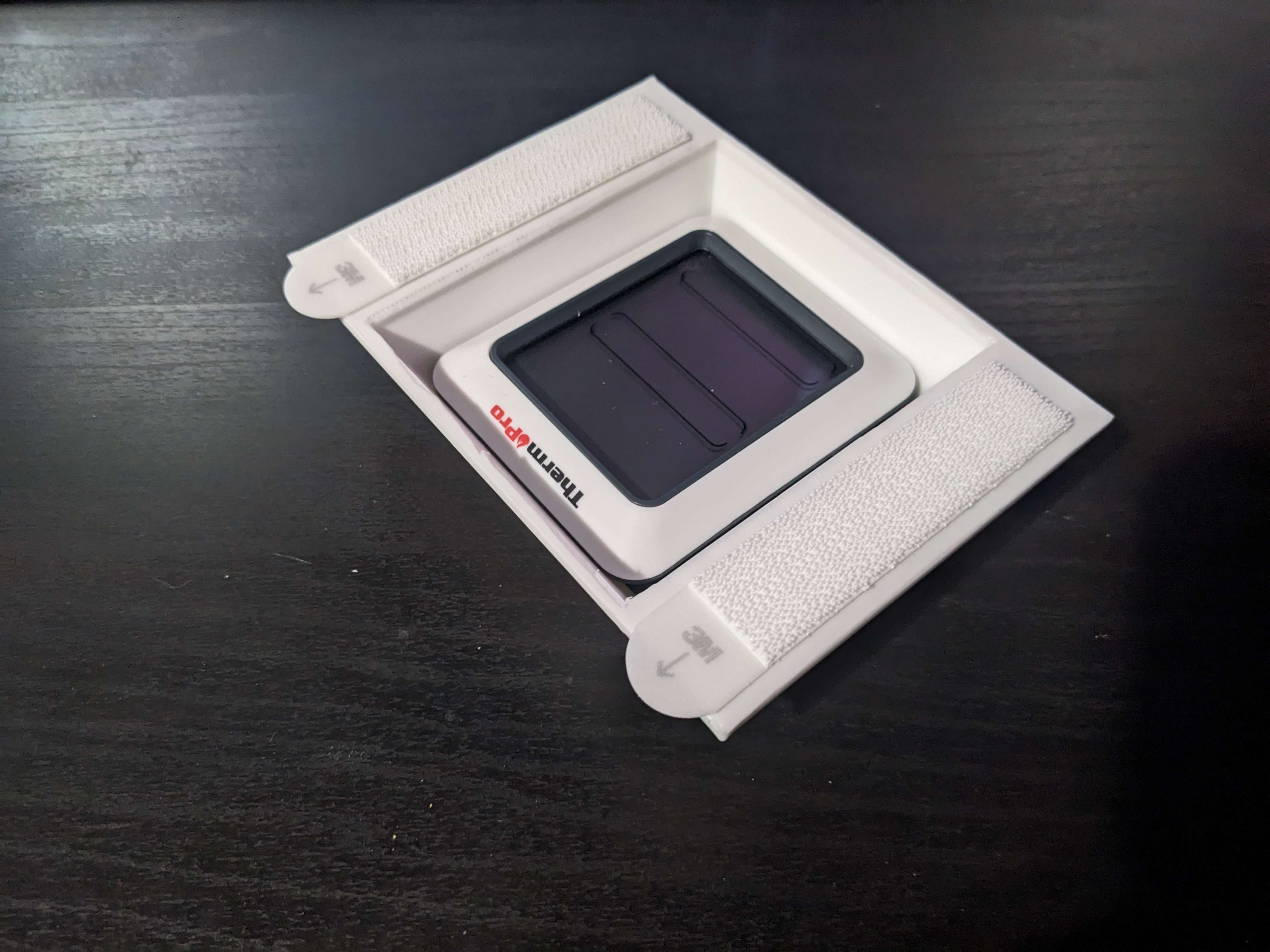 Cái đế giữ ThermoPro TP50 tui làm để gắn vô hộp chống ẩm. Có chỗ để xài keo Command strips, tháo ra gắn vô dễ dàng. In tốt nhất là để phần cánh xuống dưới. Cài đặt in: đầu phun 0.4mm, lớp 0.2mm, PLA, infill 15%.