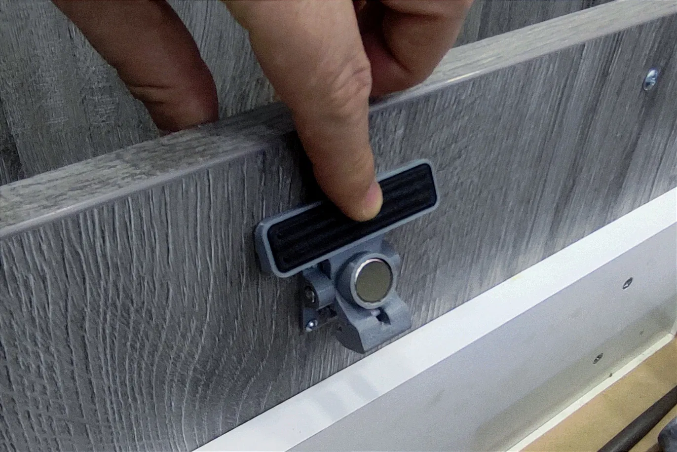 Bộ khóa nam châm cho hệ thống ngăn kéo trong ngăn kéo bếp, bao gồm cần gạt và tay nắm ẩn. Cần gạt in PETG, tay nắm in thông thường. Lắp đặt đơn giản với nam châm, chốt thép và ốc M3. Giải pháp tiện lợi để quản lý không gian bếp hiệu quả.