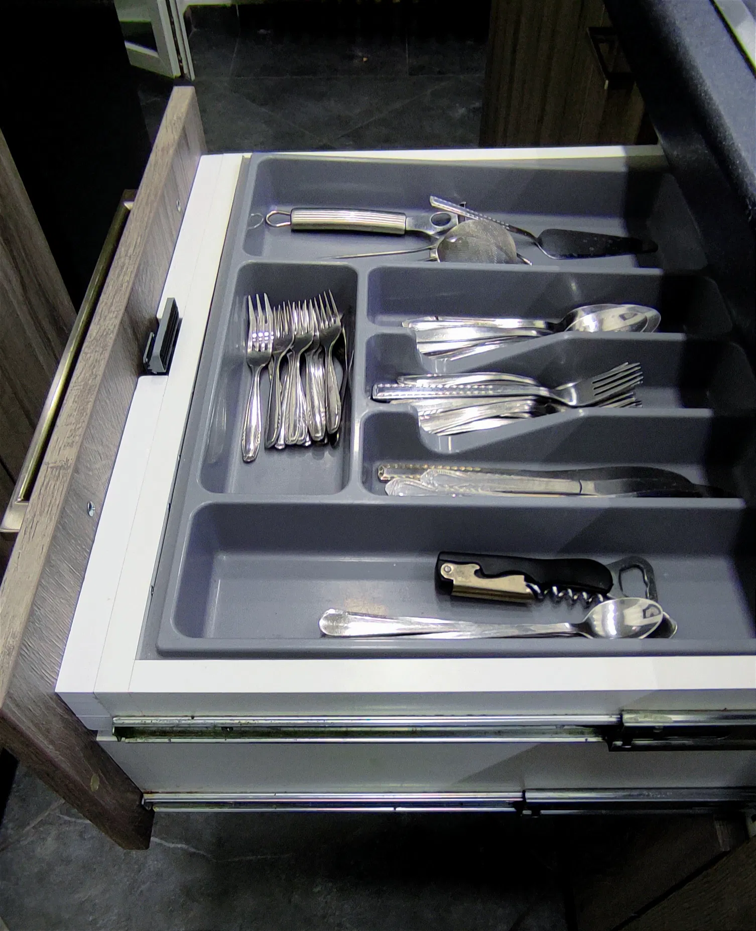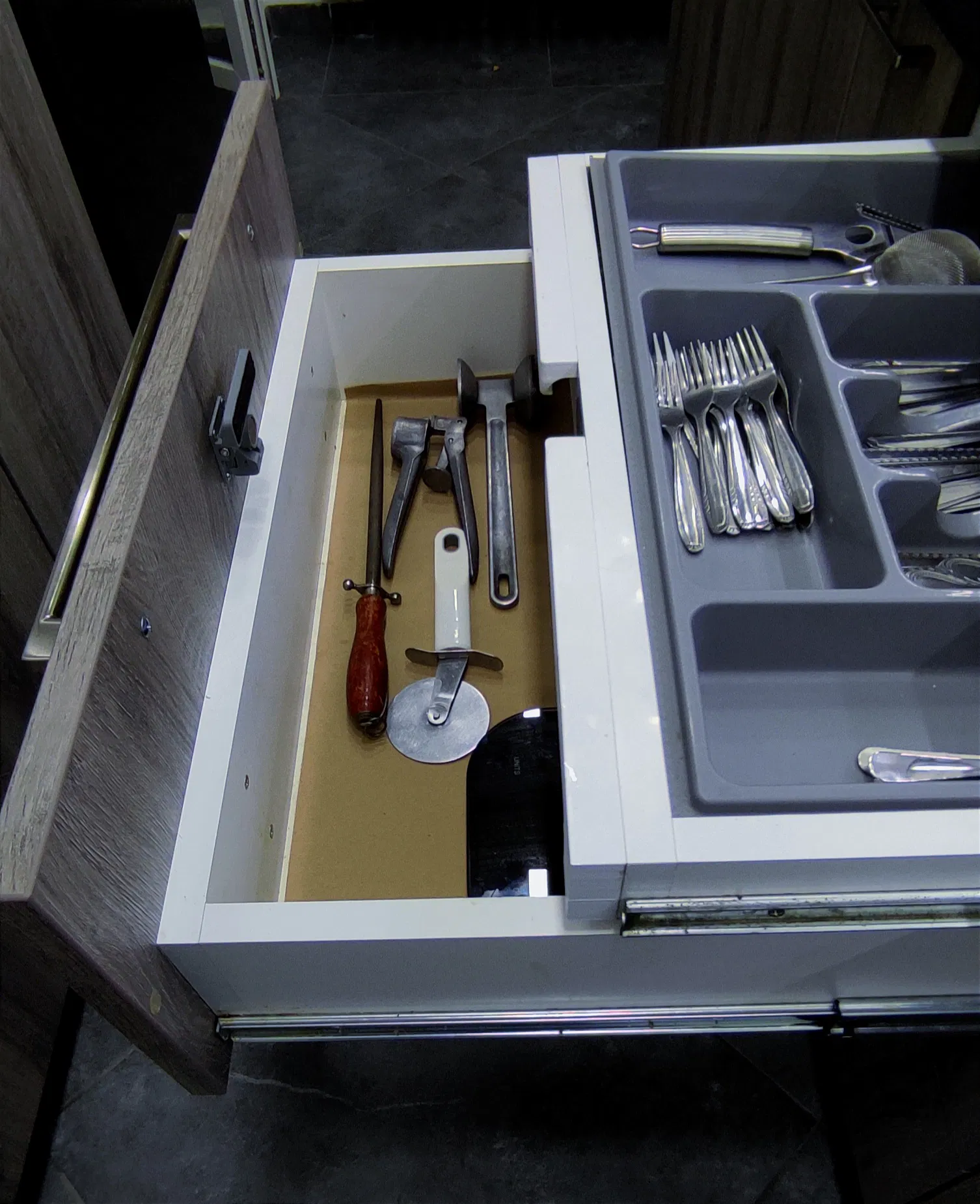 Cần gạt khóa nam châm cho ngăn kéo trong ngăn kéo bếp và tay nắm ngăn kéo ẩn.