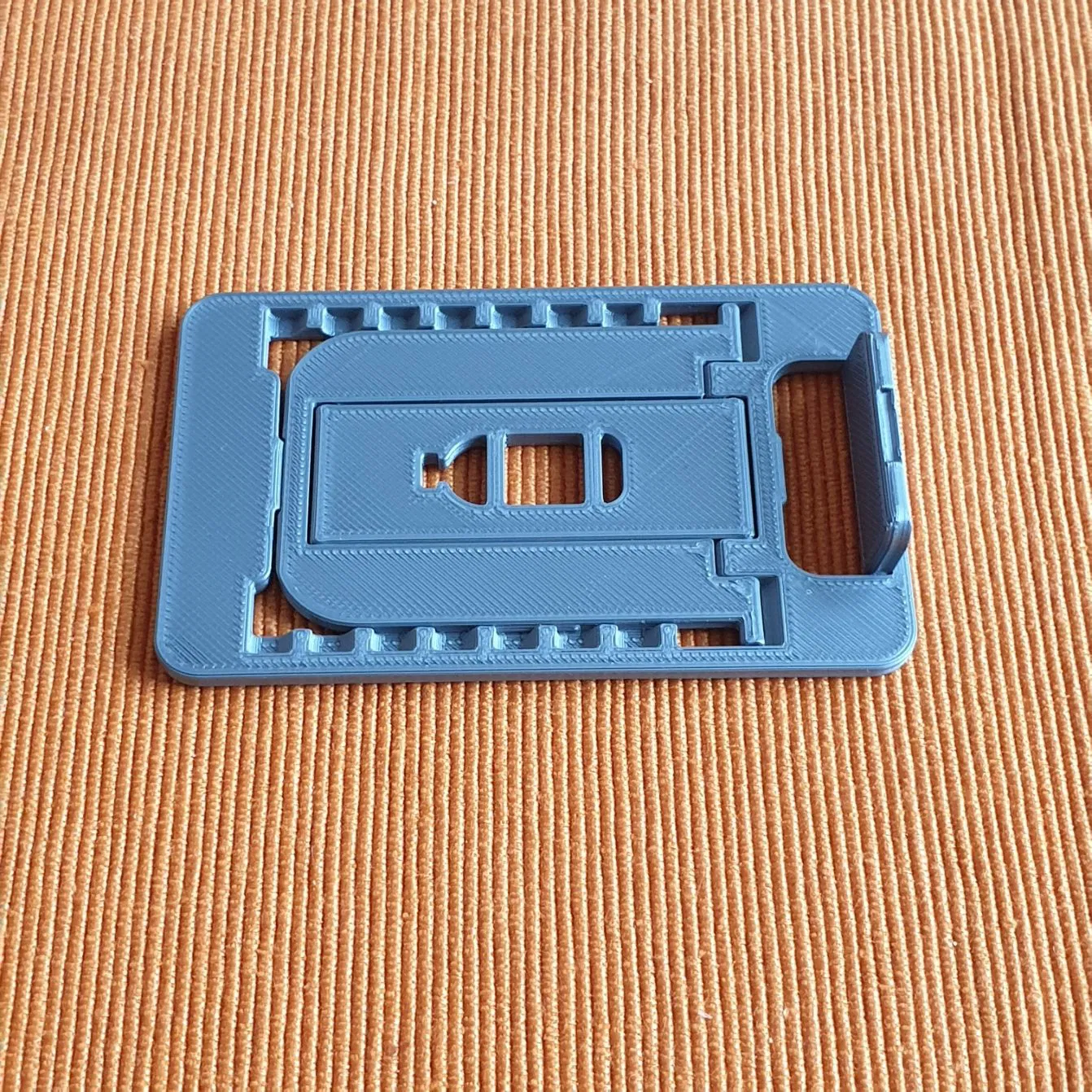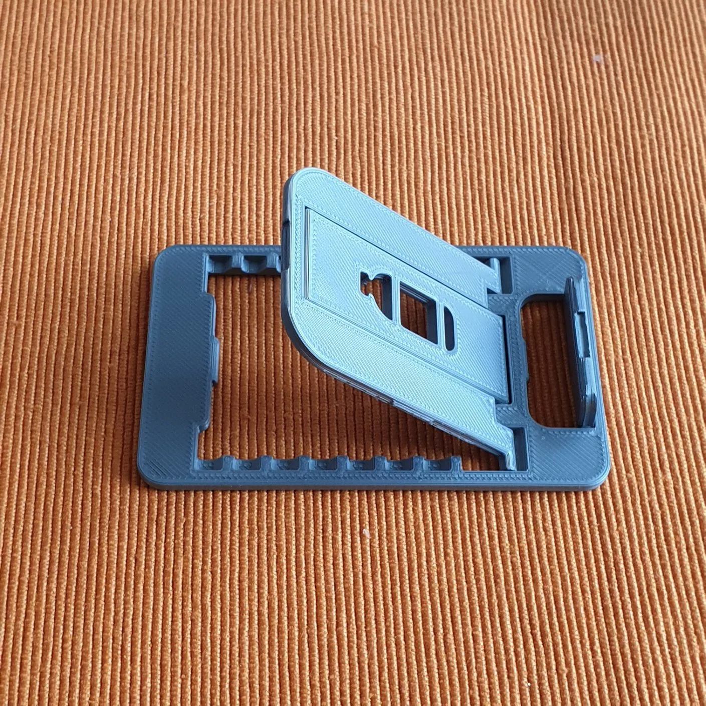 Đây là bản chỉnh sửa của giá đỡ điện thoại di động gấp gọn kích thước thẻ tín dụng, cho phép đặt điện thoại ở góc dựng hơn. Bản chỉnh sửa này cũng giúp tác giả thực hành Fusion 360 và nó in liền một khối với dung sai có thể điều chỉnh.