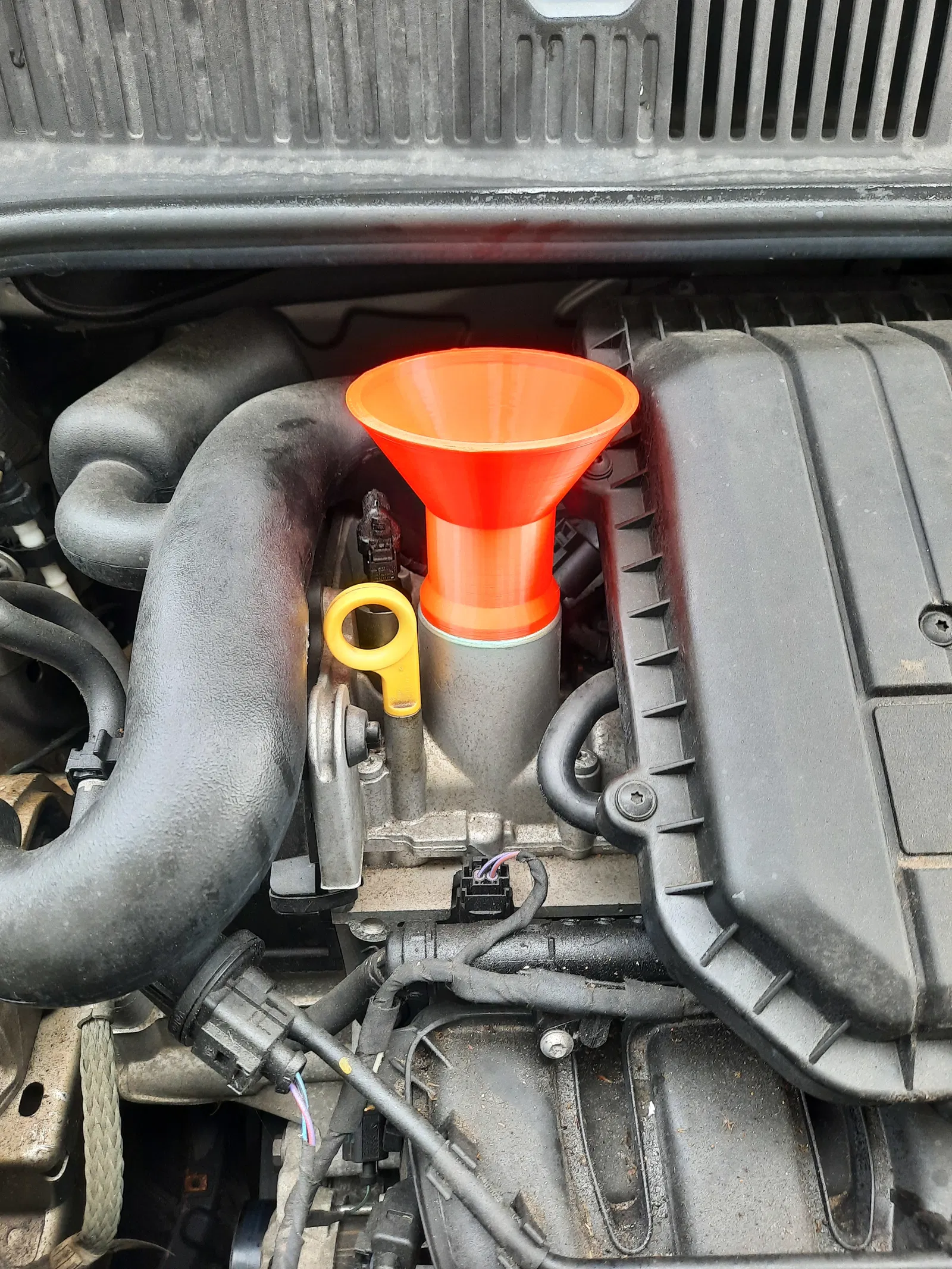 Phễu đổ dầu cho VW Up!, Skoda Citigo, Seat Mii. Phễu này sẽ khớp vào lỗ châm dầu, giúp bạn dễ dàng khi đổ dầu mà không cần phải giữ. Vừa khít 100% với các mẫu xe VAG này. Đã thử nghiệm trên VW Golf 6 TSI và nhiều mẫu VW/VAG khác. In bằng PLA, không cần hỗ trợ. Lưu ý cẩn thận khi lắp, không vặn quá chặt để tránh làm gãy tab khóa.