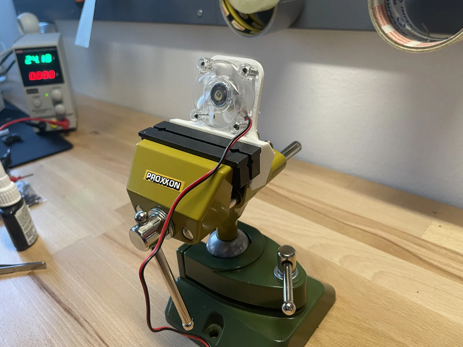 Tao hay hàn trên cái Proxxon FMZ nên tao chế cái máy hút khói đơn giản, gắn vô phía sau cái vice, xài quạt 4040. Có thể mày cần dùng một ít keo nóng để cố định nó vô cái vice nha.