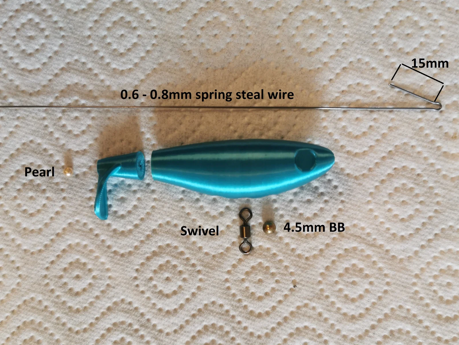 Con Whopper Plopper này in và lắp ráp dễ lắm. Dài 70mm, mà muốn phóng to cỡ nào cũng được. Dùng dây thép 0.6-0.8mm cho tỉ lệ 100%, dây thép 0.8-1mm cho tỉ lệ 120% và dây thép 1-1.2mm cho tỉ lệ 140%. Nhớ chỉ dùng dây lò xo bằng thép thôi nha!