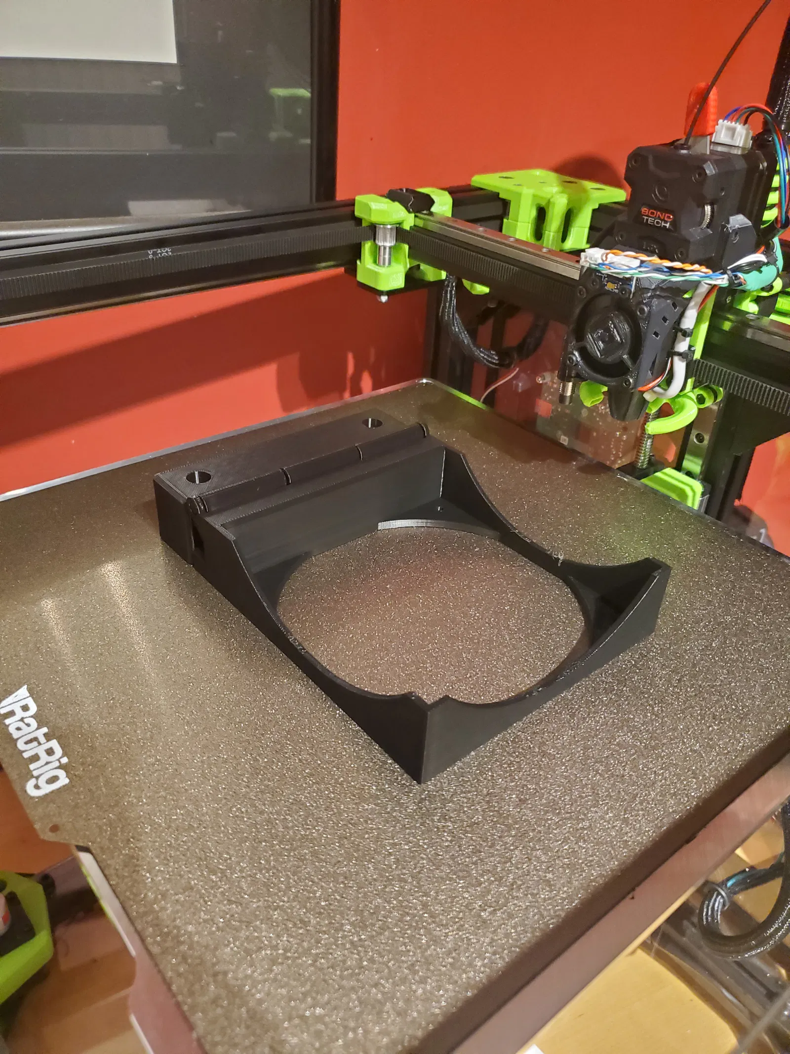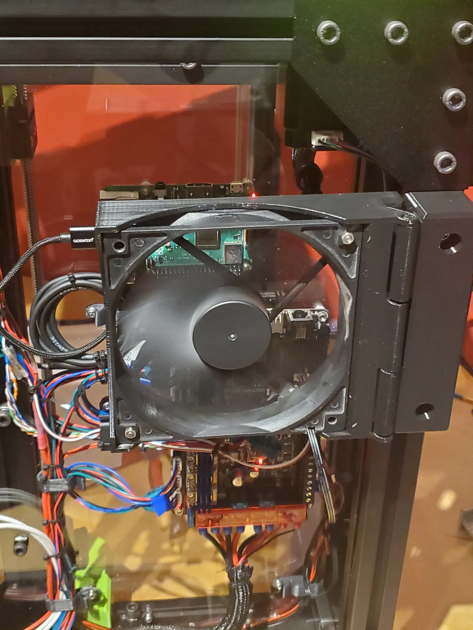 Đây là một thiết kế để tích hợp quạt tản nhiệt case 120mm cho Rat Rig V-Core 3 để làm mát Raspberry Pi. Nó gắn vào thanh nhôm 3030 phía sau bằng 2 bu lông M6 dài 20mm và 2 đai ốc T-Slot M6 cho thanh nhôm 3030. Nó in liền không cần hỗ trợ và có bản lề cho phép bạn xoay nó ra để làm bất kỳ công việc nào trên dây điện của bo mạch chủ và Pi. Tôi đã in nó với đầu phun 0.4mm ở chiều cao lớp 0.25mm, chiều rộng lớp 125% và không cần hỗ trợ bằng Superslicer. PLA là tối ưu vì nó sẽ không bị nóng trong mục đích này. Có các lỗ để dán nam châm vào để giữ cho nó ổn định khi sử dụng. Có thể chọn nam châm có đường kính 6, 8, 10 hoặc 12mm, dày 2mm.