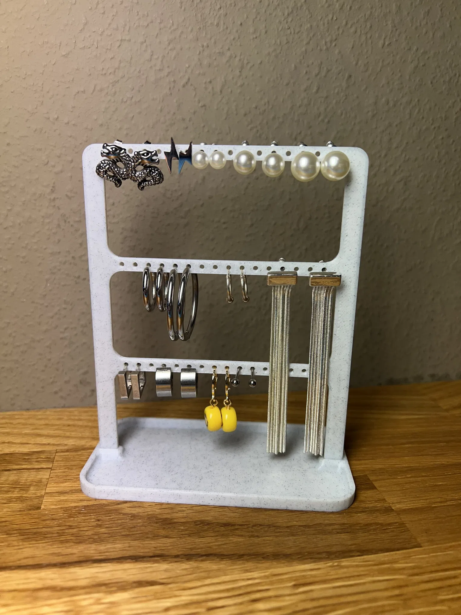 Chán ngấy với việc lục lọi trong đống trang sức trông như tổ chim vậy? Gặp gỡ em đựng hoa tai mới của bạn — vị anh hùng mà đôi bông tai của bạn xứng đáng có được! Với ba hàng, mỗi hàng 16 lỗ, nó có thể trưng bày tự hào tới 24 đôi, vậy là bạn cuối cùng cũng có thể ngừng đeo cùng một đôi khuyên nụ mỗi ngày chỉ vì đó là đôi duy nhất bạn tìm thấy.