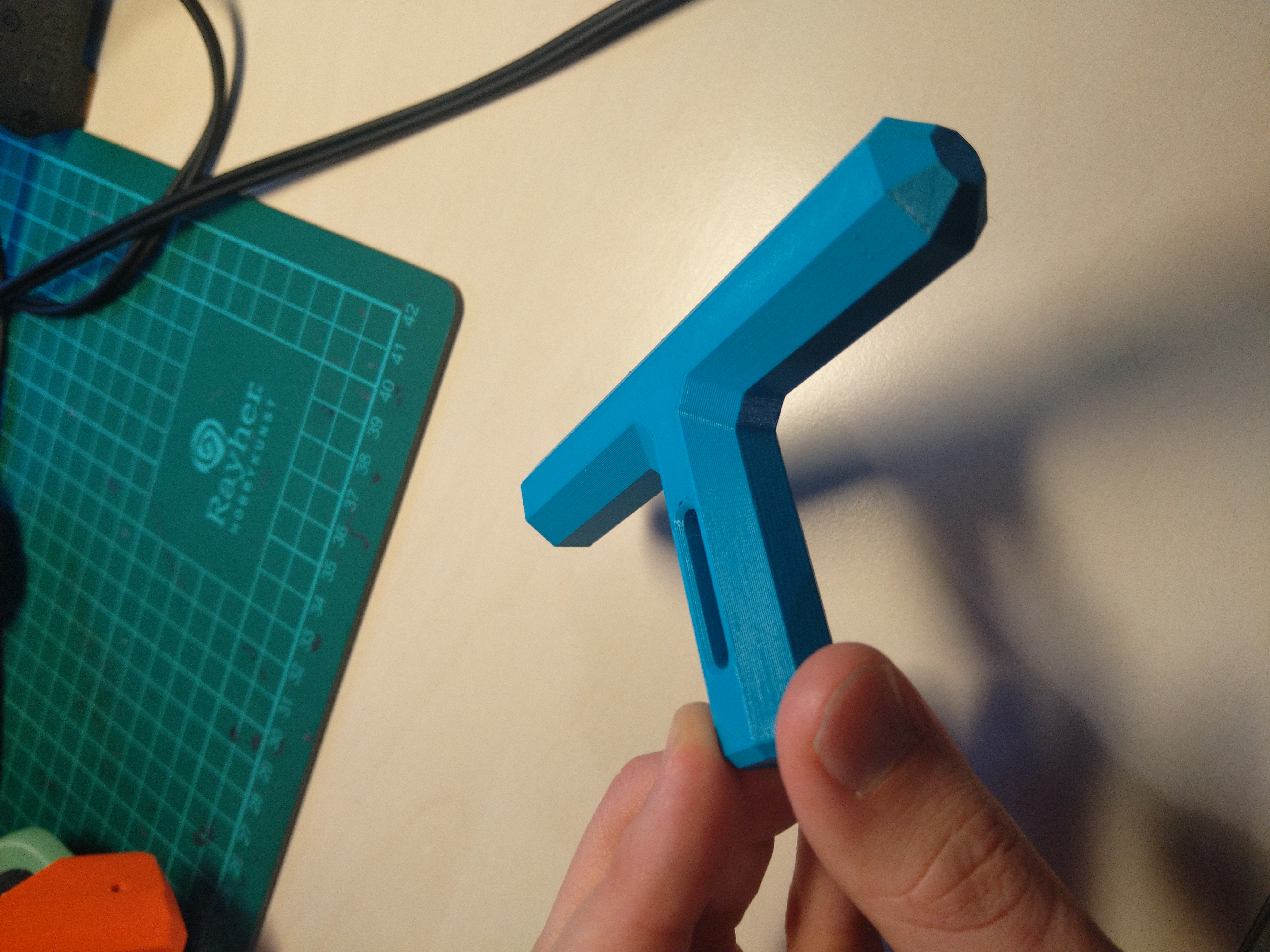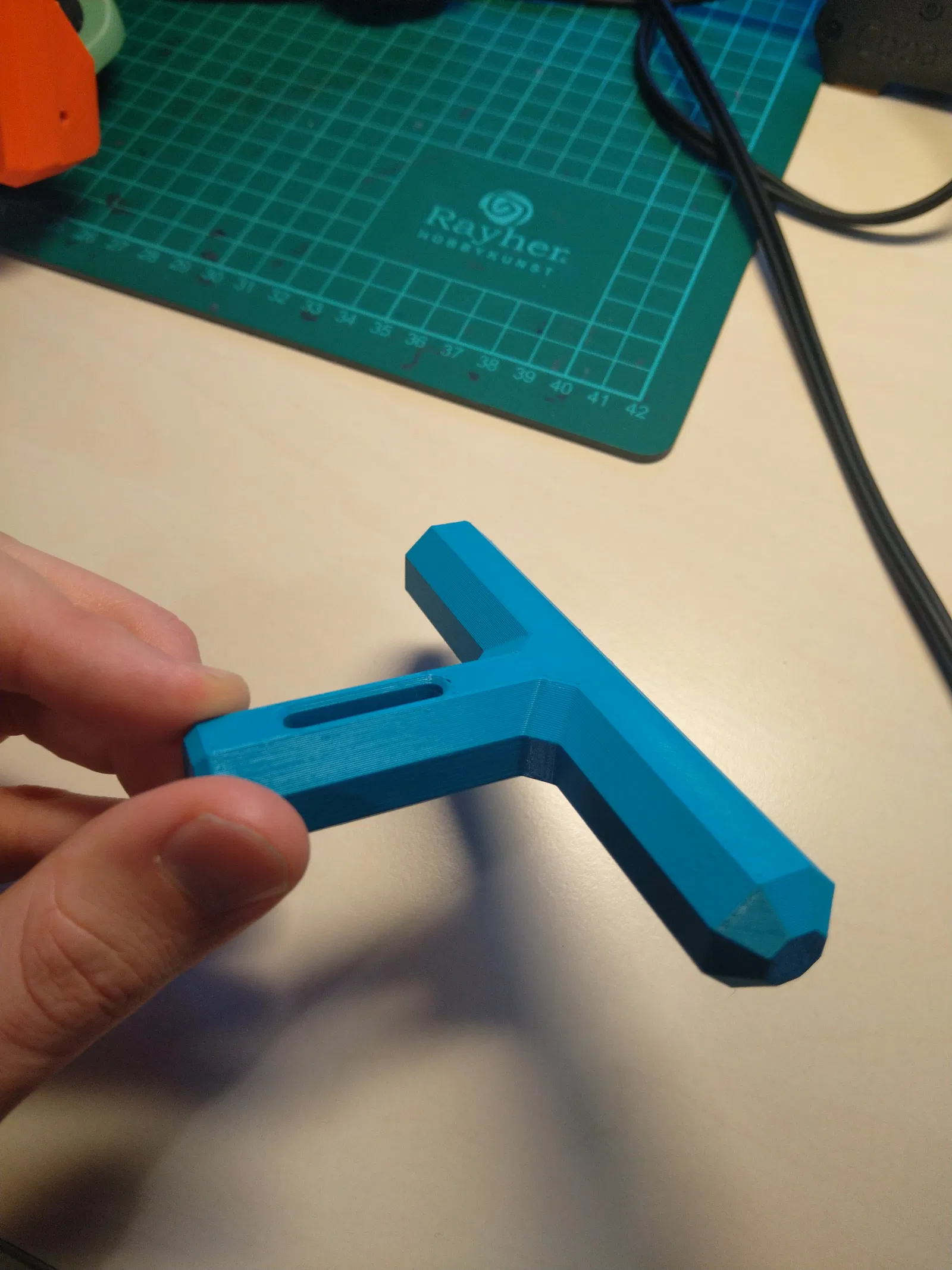 In bằng PETG với 15% lưới tam giác và không cần support. Đặt phẳng trên bàn in để tăng thêm độ bền cho phần T.