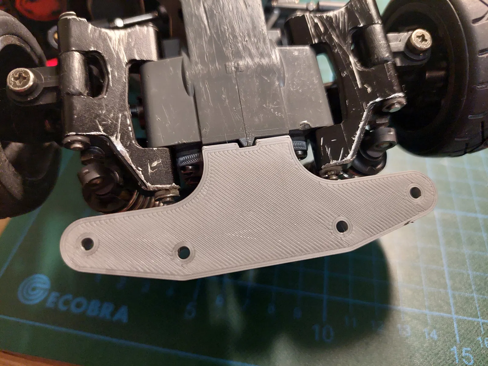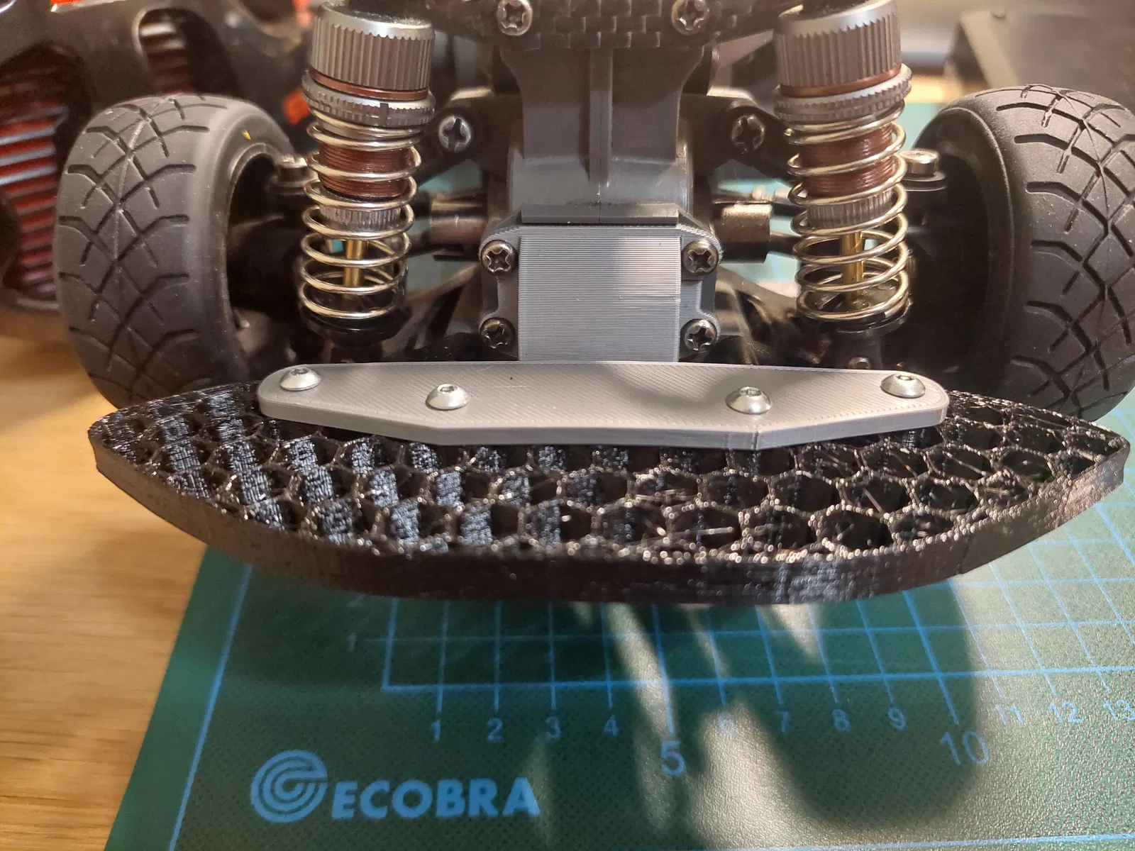 Đã lật và sửa đổi ngàm Bumper để gắn Bumper thấp hơn. Model này sử dụng thanh đỡ Bumper từ phiên bản gốc, giúp tùy chỉnh vị trí cản trước cho xe RC của bạn. Phù hợp với vật liệu in PLA và TPU, file STL sẵn sàng để tải về.